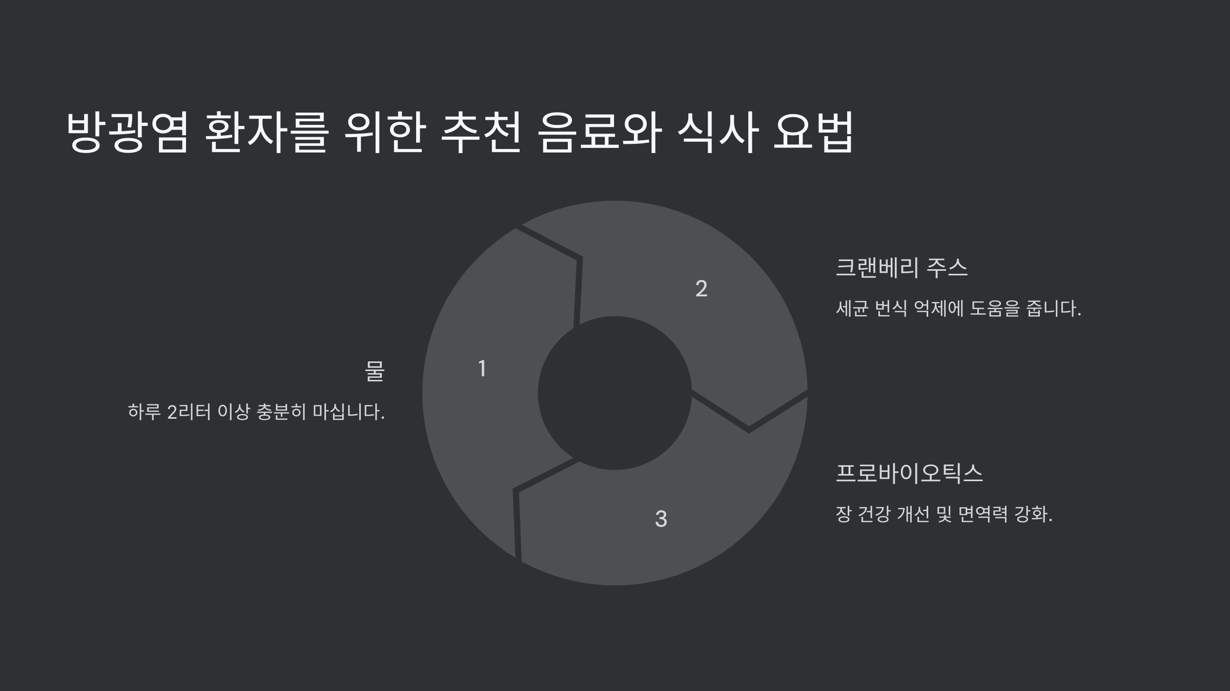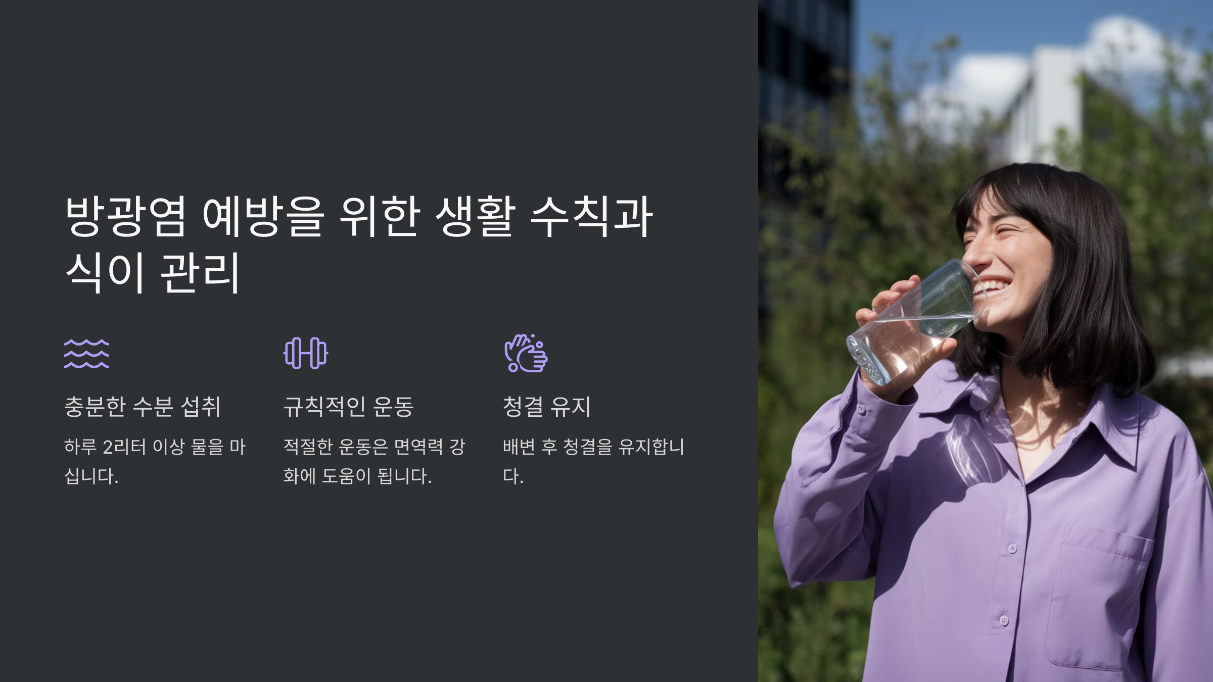 방광염이 있을 때는 자극적인 음식과 음료를 피하고, 물을 충분히 섭취하는 것이 가장 중요해요! 건강한 생활습관을 유지하면서 방광 건강을 지켜요. 🚰