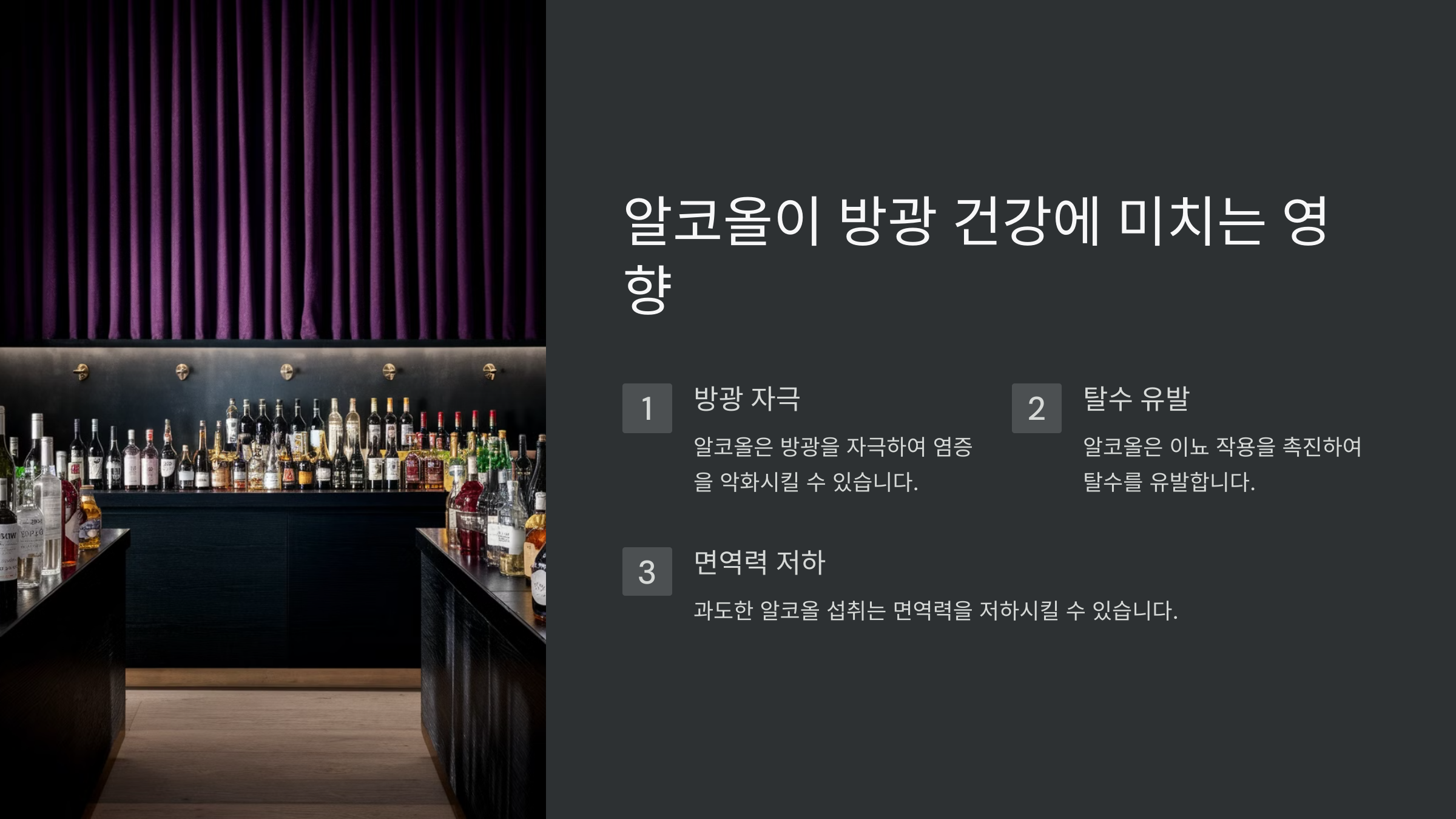 방광염이 있을 때 술을 마시는 것은 불난 집에 부채질하는 것과 같아요. 알코올은 방광을 자극하는 대표적인 물질 중 하나로, 염증을 악화시키고 증상을 더 심하게 만들어요.
