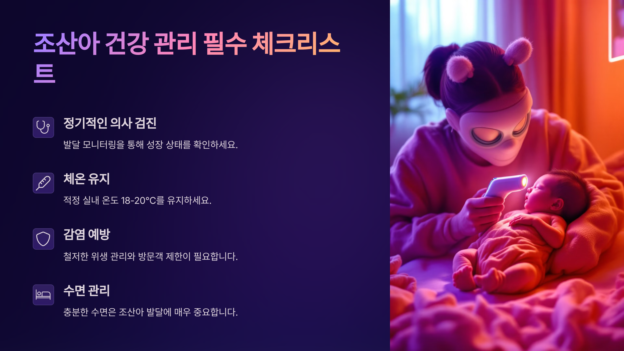 1️⃣ 체온 유지 – 조산아는 체온 조절이 어려워서 적절한 실내 온도(24~26도)와 습도(50~60%)를 유지해야 해요.