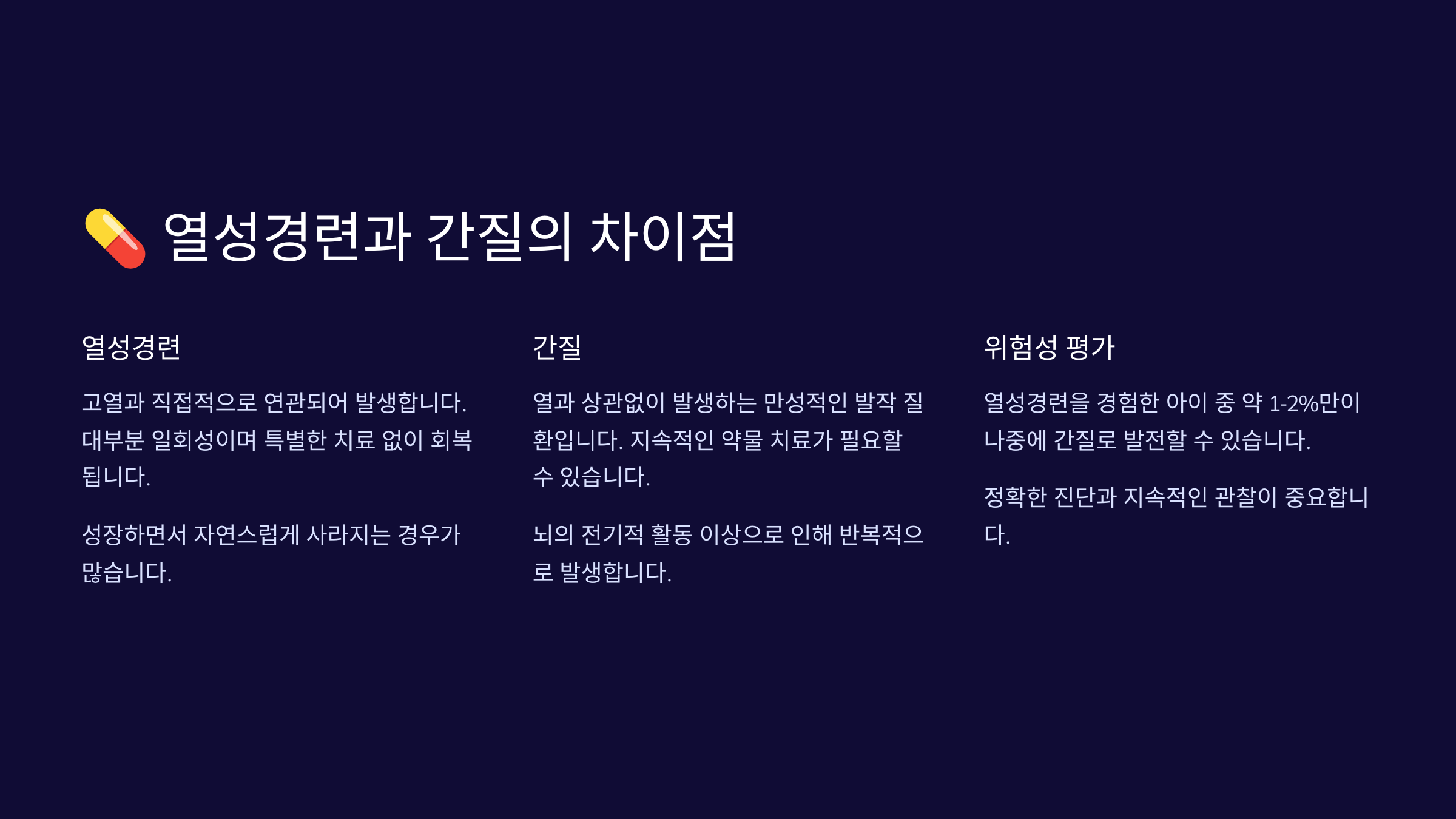 열성경련은 고열로 인해 일시적으로 발생하는 반면, 간질(Epilepsy)은 반복적인 경련을 특징으로 하는 신경계 질환이에요. 둘의 차이를 이해하면 불필요한 걱정을 줄일 수 있어요. 🔍