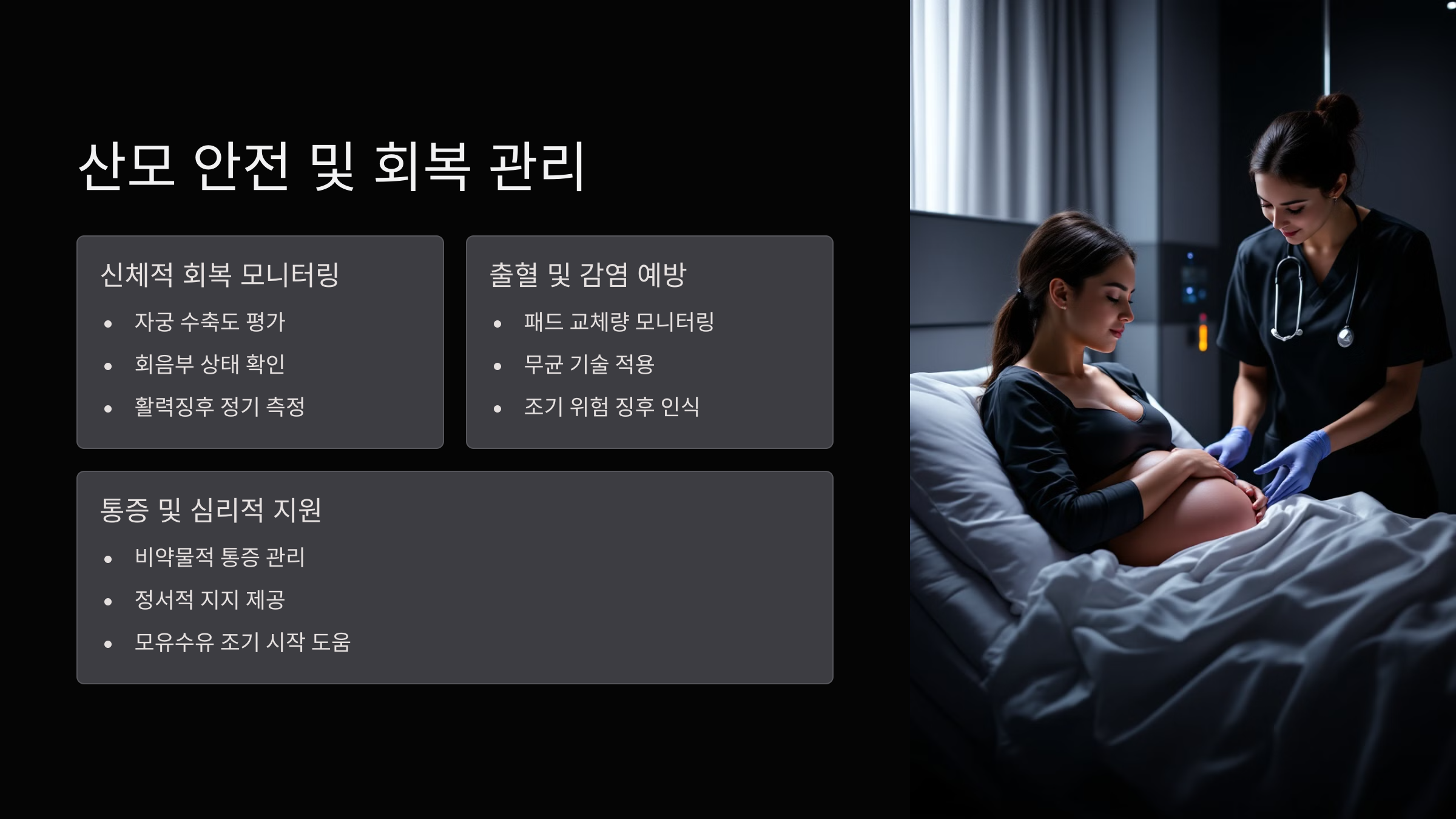 분만 후 | 출혈 및 감염 예방, 모유 수유 지원 |
