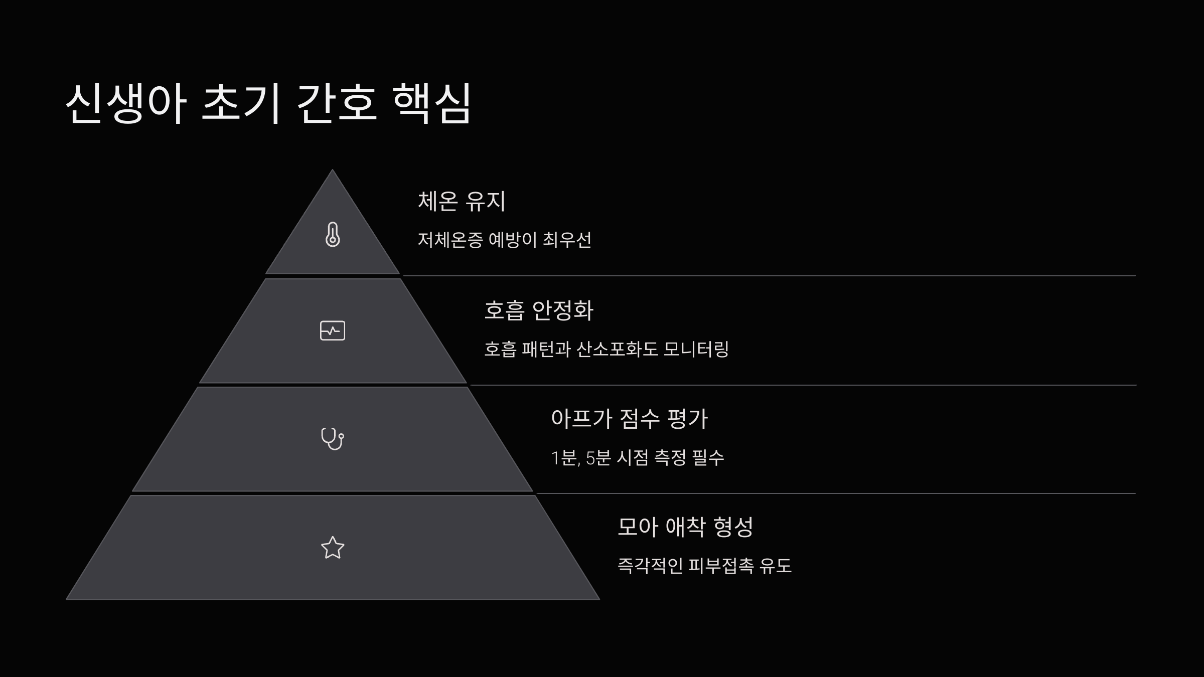| 호흡 및 심박수 확인 | 출생 직후 자발 호흡 여부 확인 |