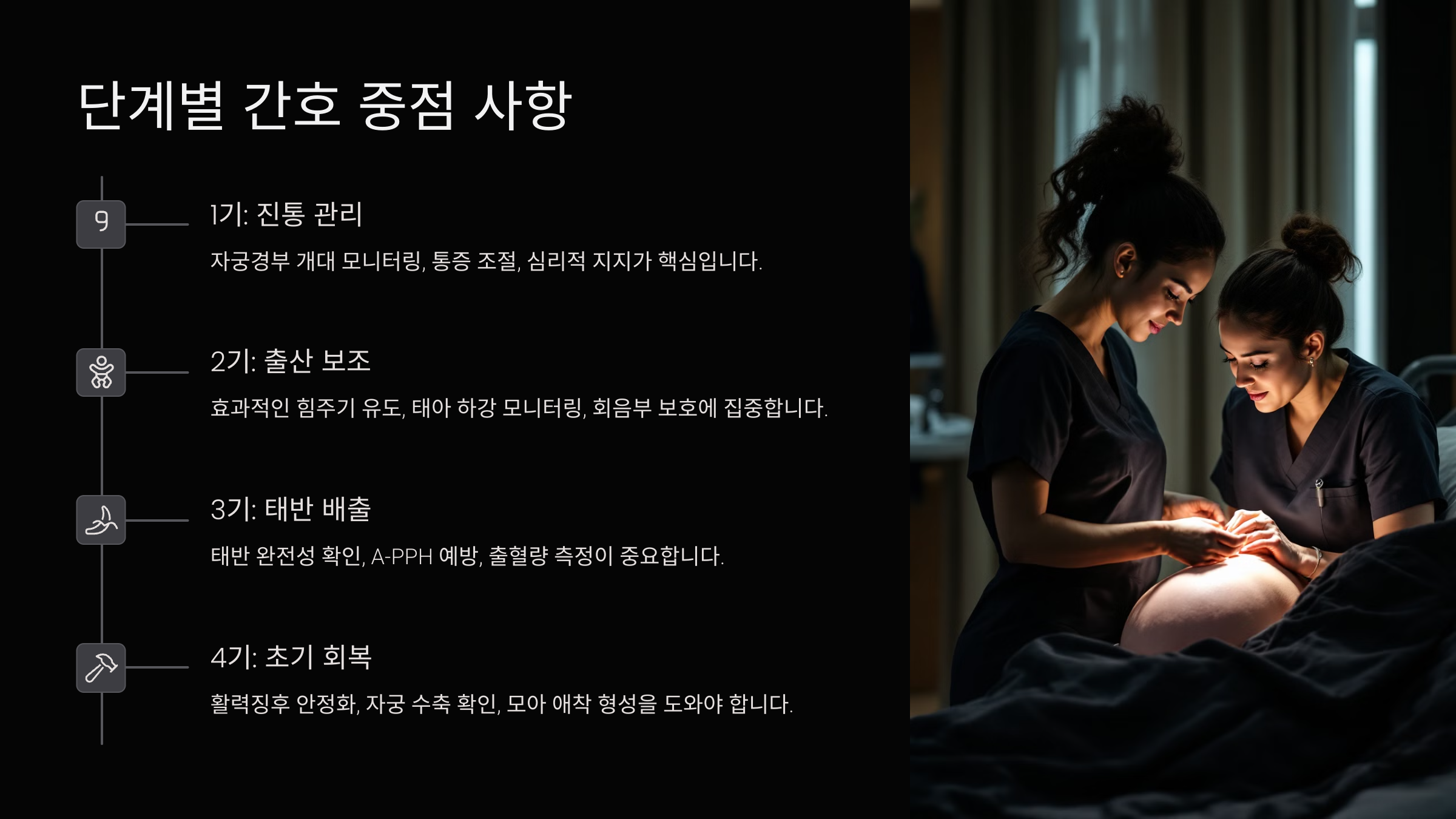 | 후산기(태반 만출) | 출혈 감시, 자궁 수축 확인 |