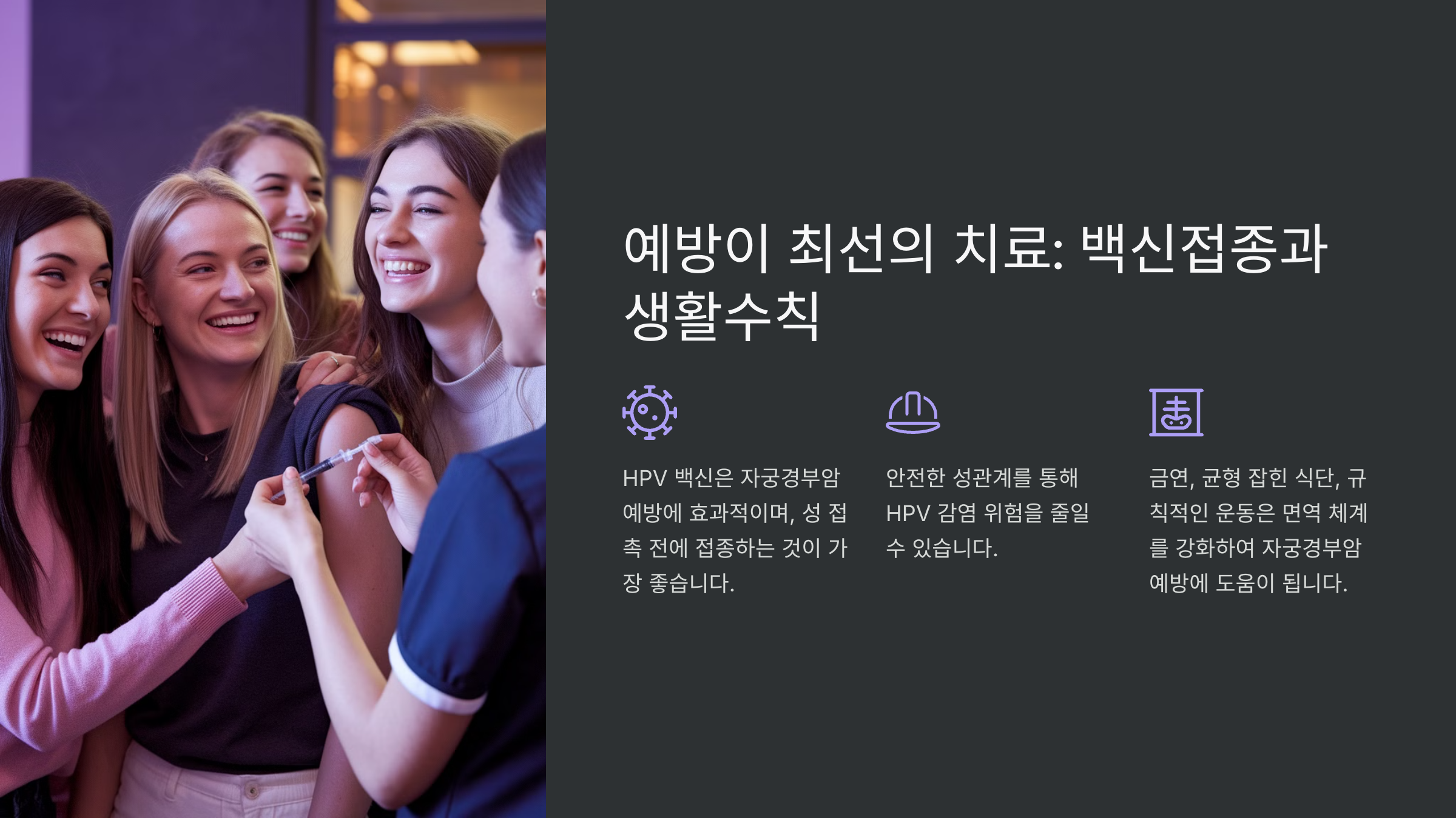자궁경부암을 예방하는 가장 효과적인 방법은 바로 HPV 백신 접종이에요. 하지만 백신만으로 모든 위험을 막을 수 있는