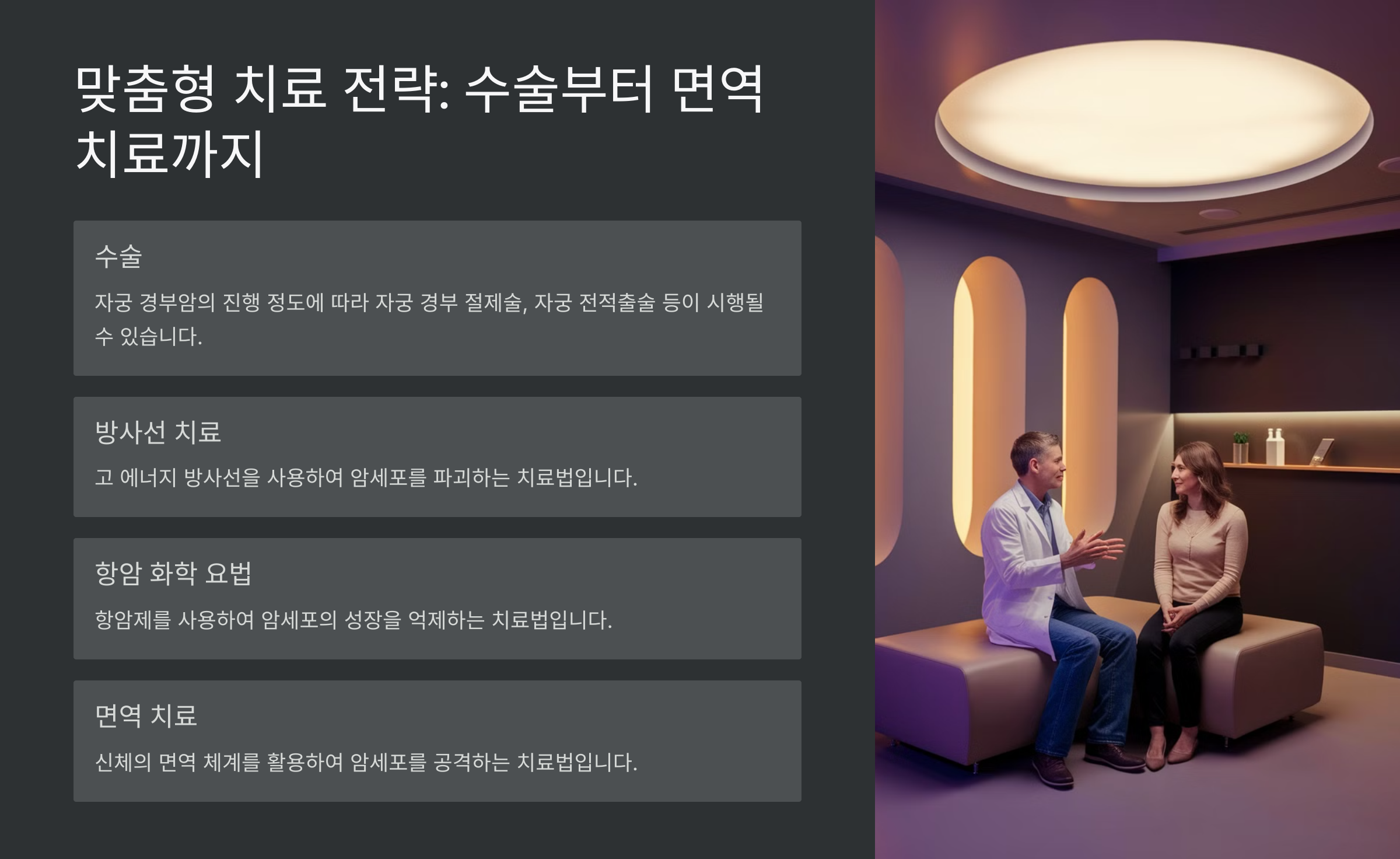🔹 **초기 치료(0~1기)**: 원추절제술, 자궁적출술 🔹 **진행성 치료(2기 이상)**: 방사선 치료, 항암치료, 면역치료 🔹 **재발 및 전이 치료**: 표적치료제, 임상시험 참여 고려