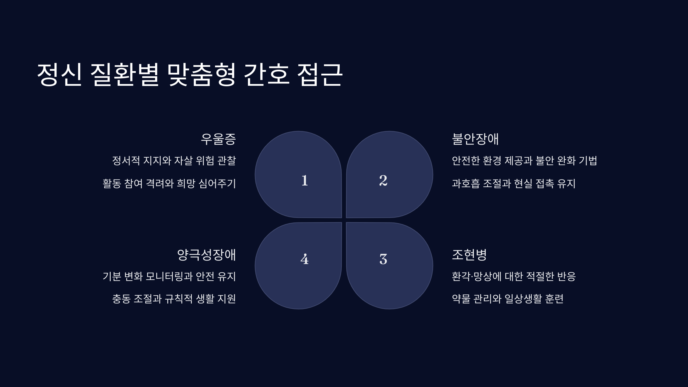 셋째, 조울증(양극성 장애) 환자는 기분의 변화가 극단적이에요. 조증 상태일 때는 흥분을 가라앉히는 것이 중요하고, 우울 상태일 때는 안전을 확보하는 것이 우선이에요. 특히 조증 상태에서는 환자가 충동적인 행동을 할 수 있기 때문에 신체 활동을 제한하고 과도한 자극을 피하는 것이 필요해요.