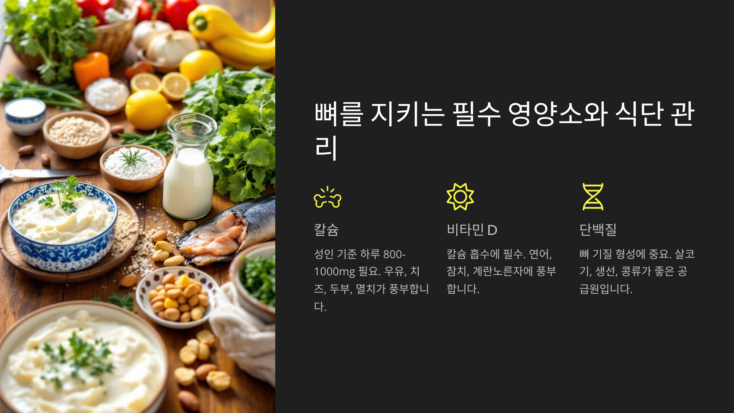 📢 이제 뼈를 튼튼하게 해주는 필수 영양소와 식단 관리에 대해 알아볼까요?