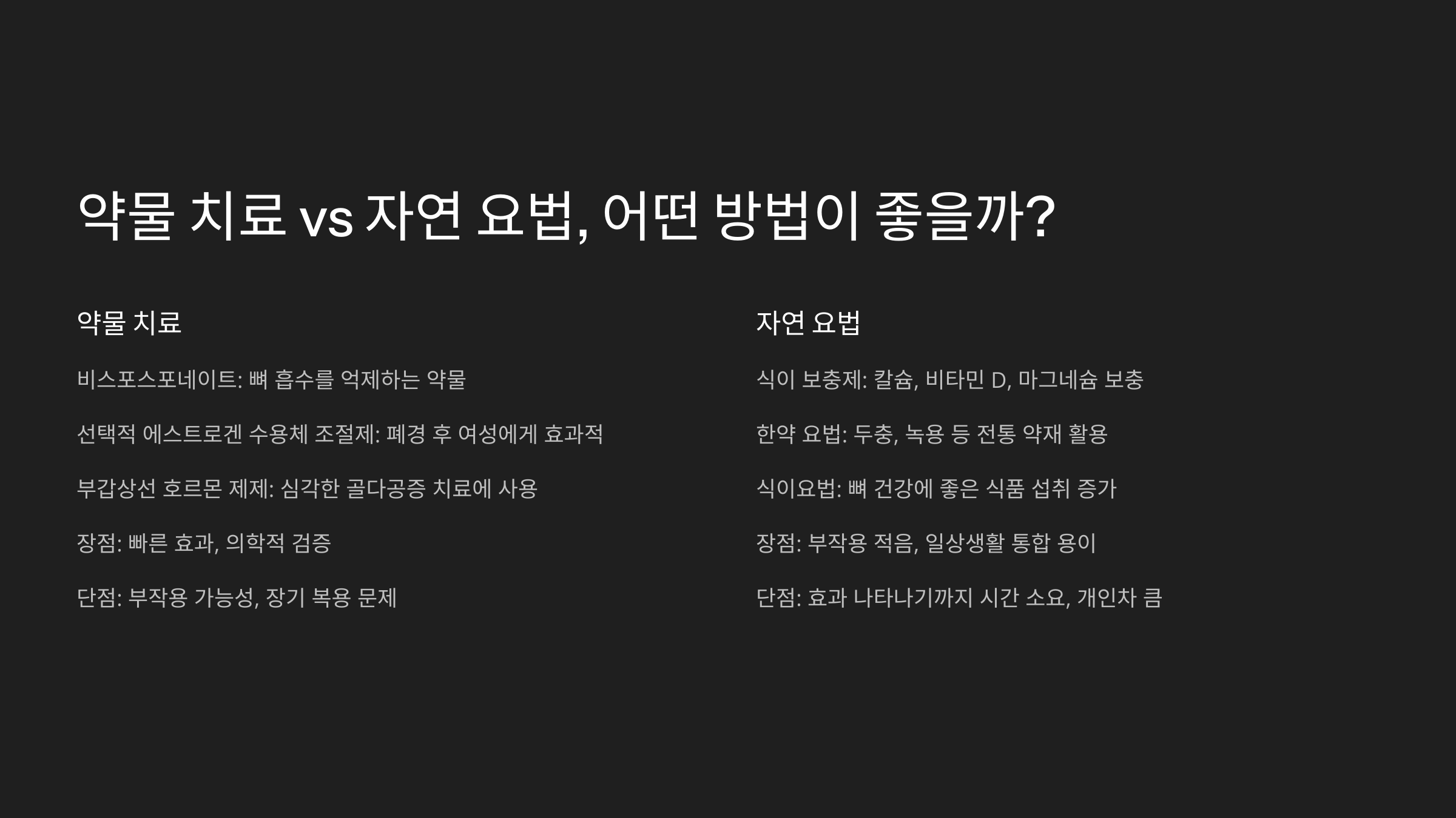 골다공증을 예방하고 치료하는 방법에는 크게 약물 치료와 자연 요법이 있어요. 약물 치료는 빠르게 효과를 볼 수 있지만 부작용이 있을 수 있고, 자연 요법은 부작용이 적지만 효과를 보려면 시간이 오래 걸린다는 점이 있어요. 🤔