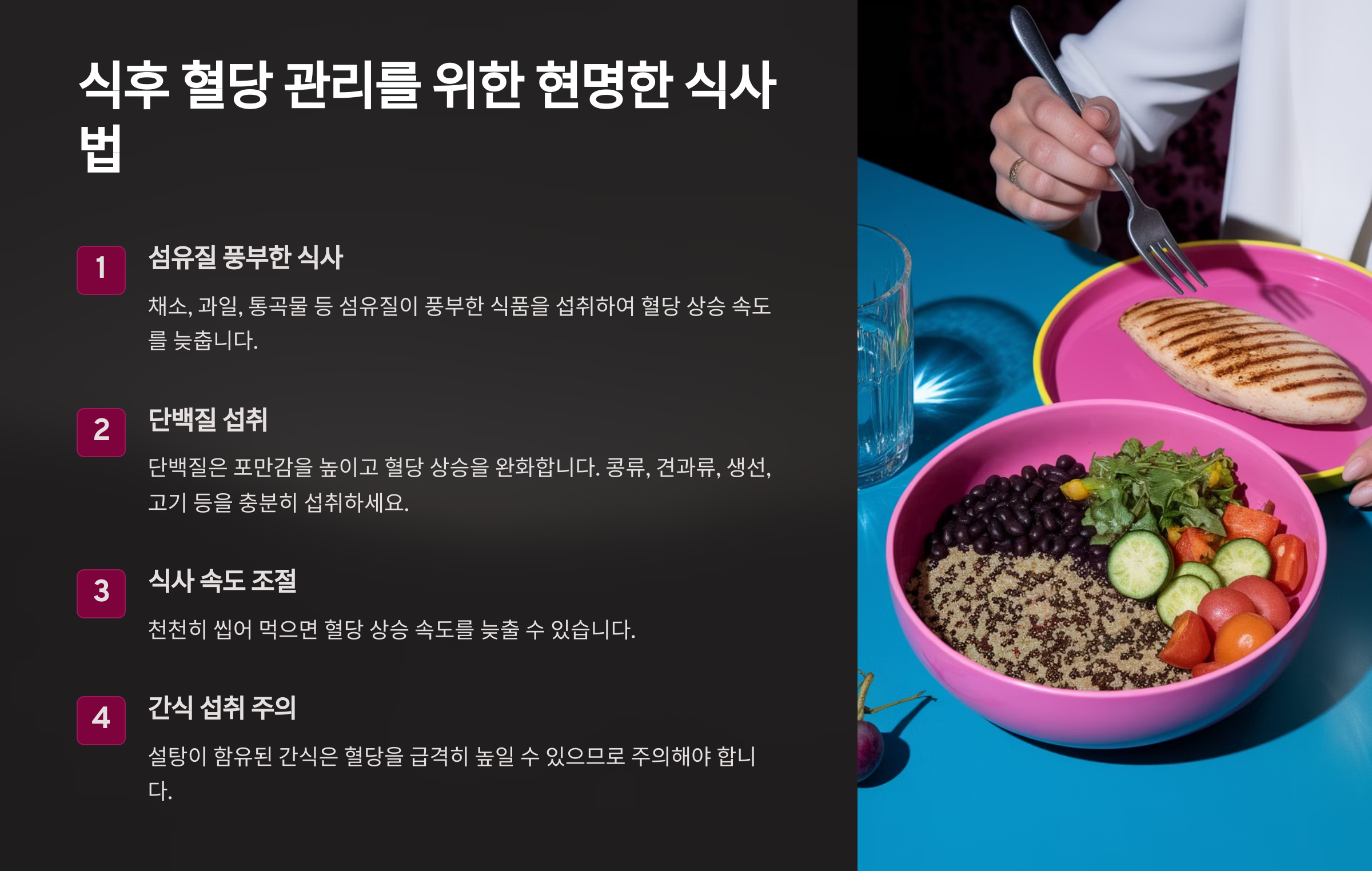 혈당 스파이크를 막으려면 무엇보다 **올바른 식습관**이 중요해요. 같은 음식을 먹더라도 어떤 순서로, 어떤 방식으로 섭취하느냐에 따라 혈당 변화가 크게 달라질 수 있답니다!