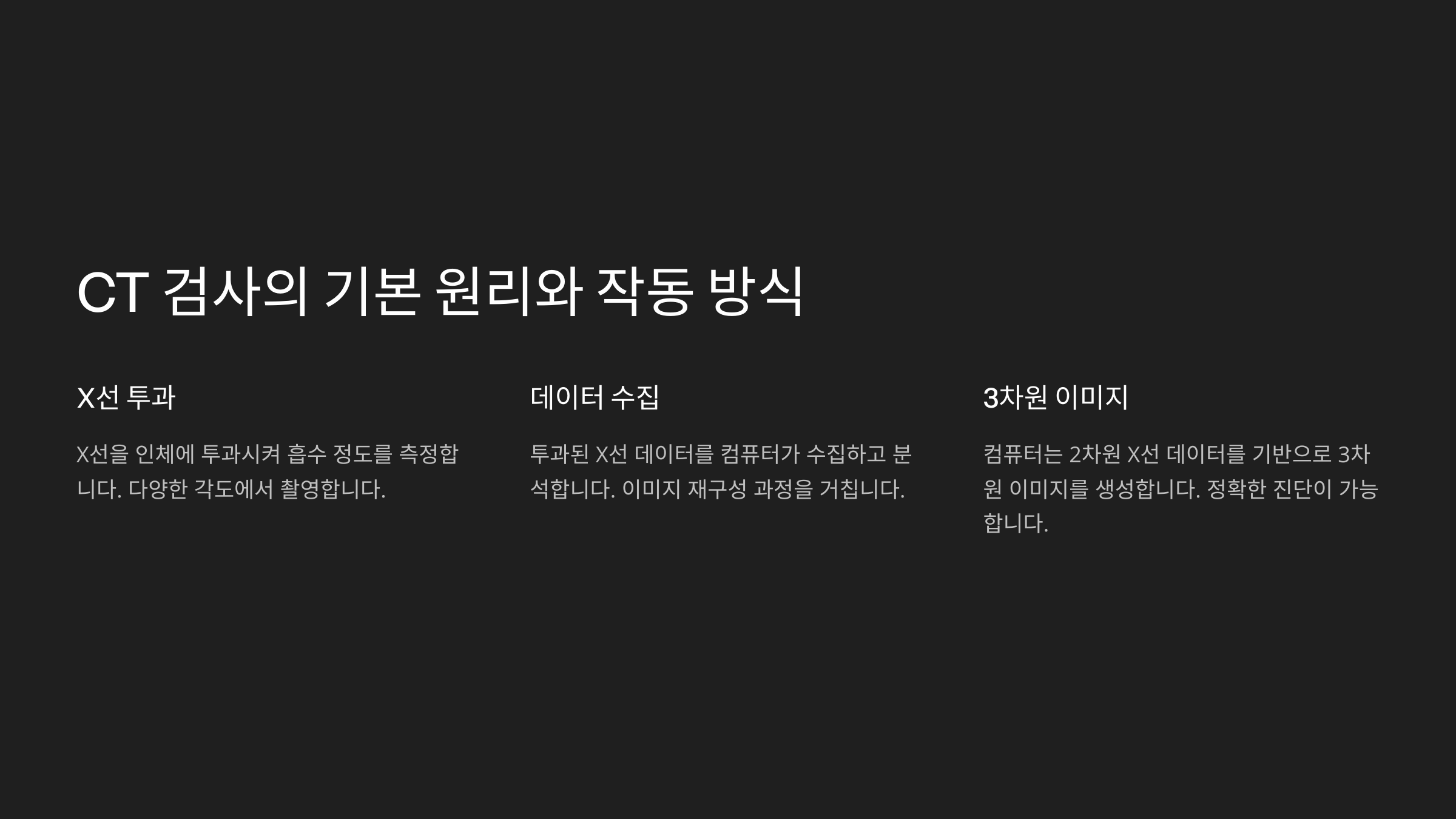 CT검사는 X선을 이용해 신체의 단면을 촬영하는 기술이에요. 일반적인 엑스레이는 한 방향에서 찍은 2D 이미지지만, CT