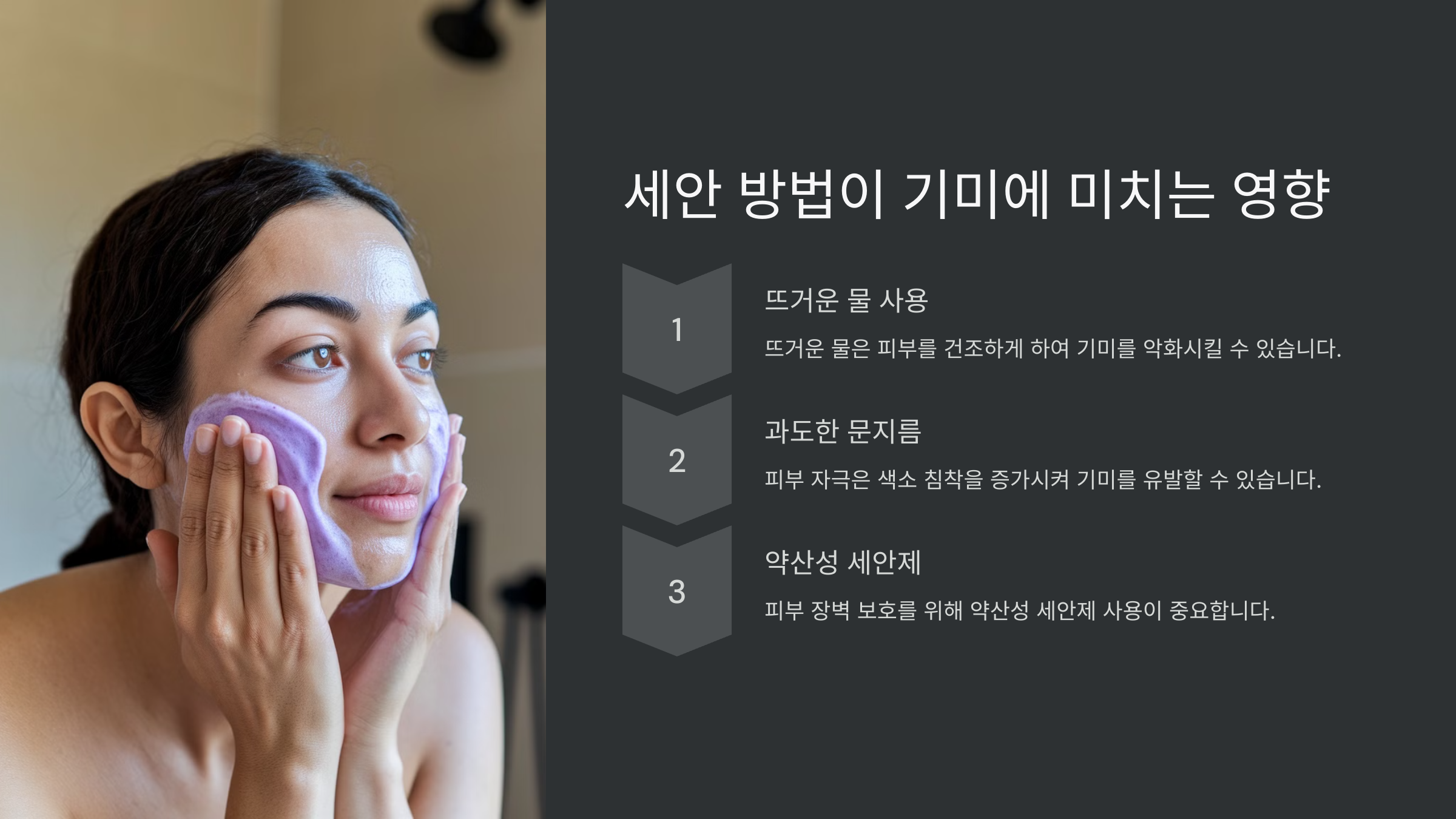 이처럼 일상 속 작은 습관들이 기미를 악화시킬 수 있어요. 그렇다면 세안 방법도 기미에 영향을 미칠까요? 다음에서 알아보겠습니다! 🚿