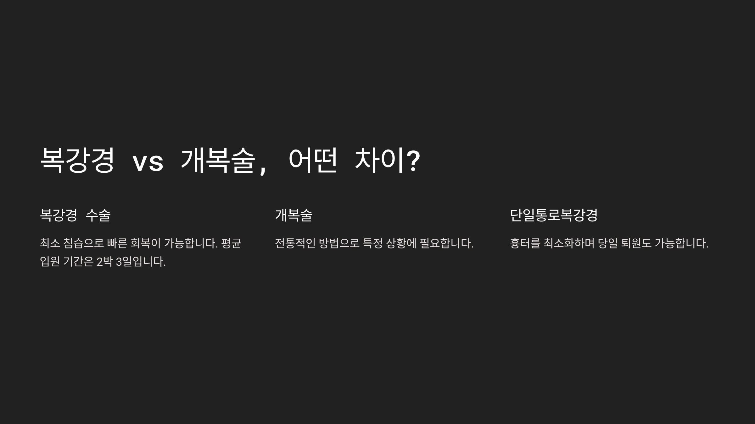 복강경 수술은 회복이 빠르고 흉터가 적어 선호되지만, 개복술이 필요한 경우도 있으니 무조건 한 가지 방법만 고집하기보다는 의료진의 권고를 따르는 게 좋아요. 😊