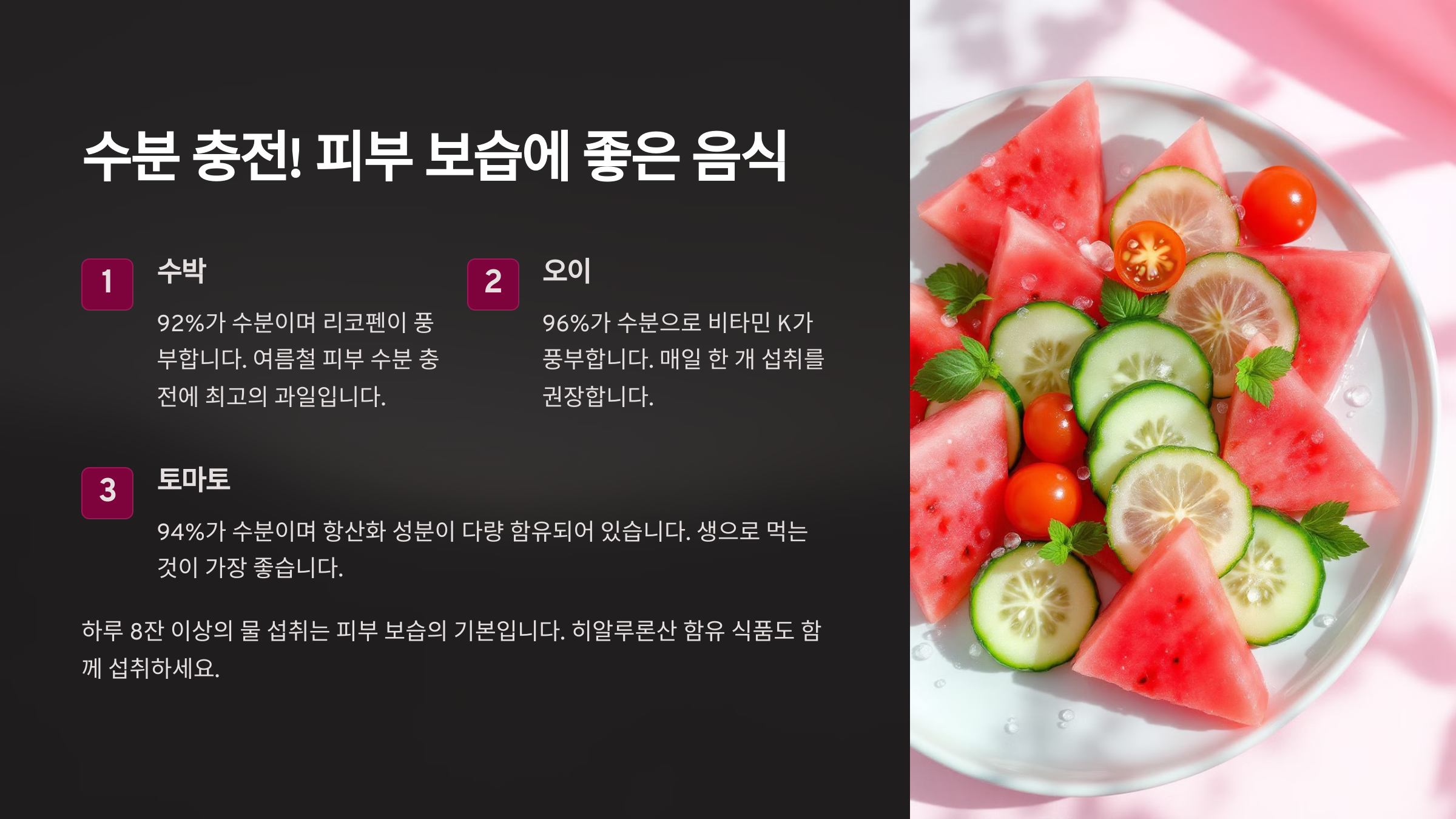 수분을 많이 함유한 오이, 수박, 셀러리 같은 음식은 피부 보습에 효과적이에요. 특히 오이는 95% 이상이 수분으로 이루어져 있어서 피부에 촉촉함을 더해줘요. 🍉