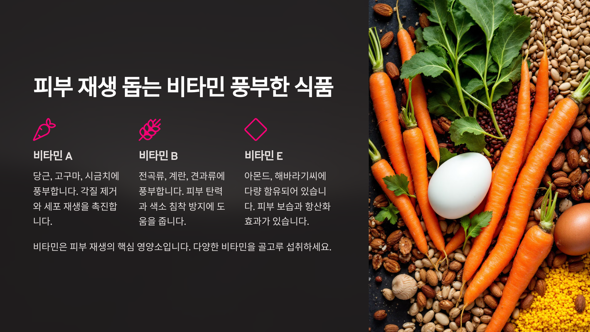 예를 들어, 당근은 비타민A가 풍부해서 피부 회복에 탁월해요. 또한, 시금치와 고구마도 강력한 피부 재생 효과가 있어요. 🥬