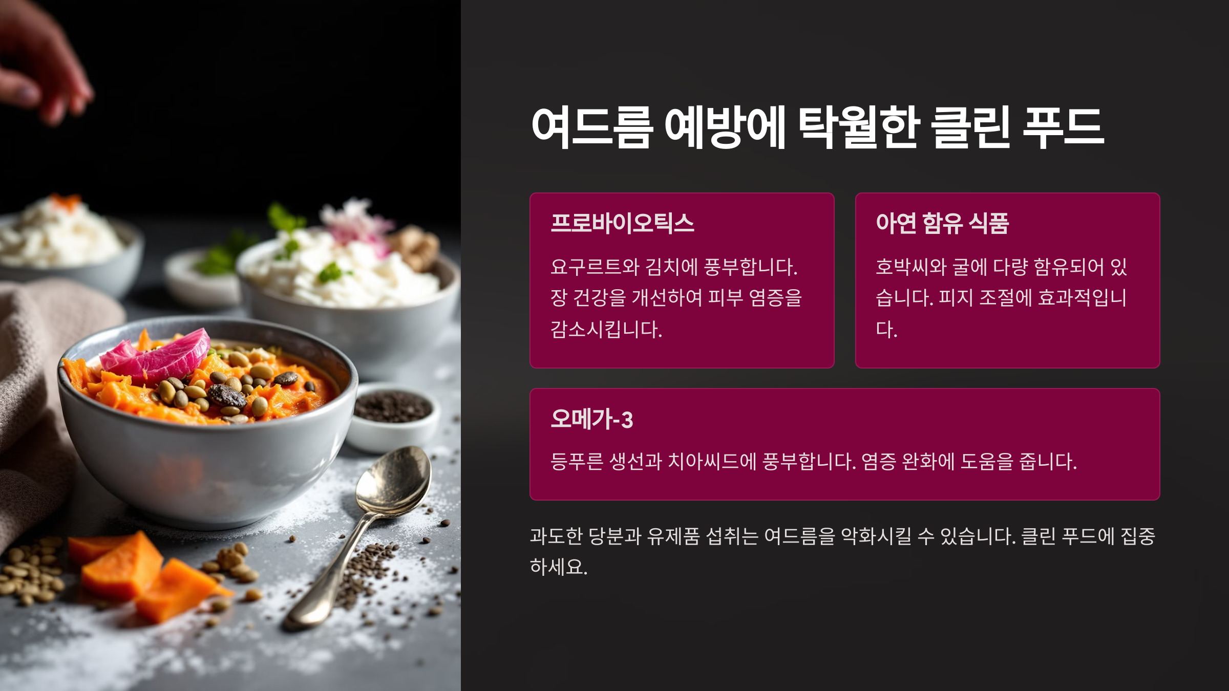 여드름은 피지 분비와 염증이 원인이에요. 이를 막으려면 피부를 깨끗하게 유지하는 음식이 필요하죠. 🥦