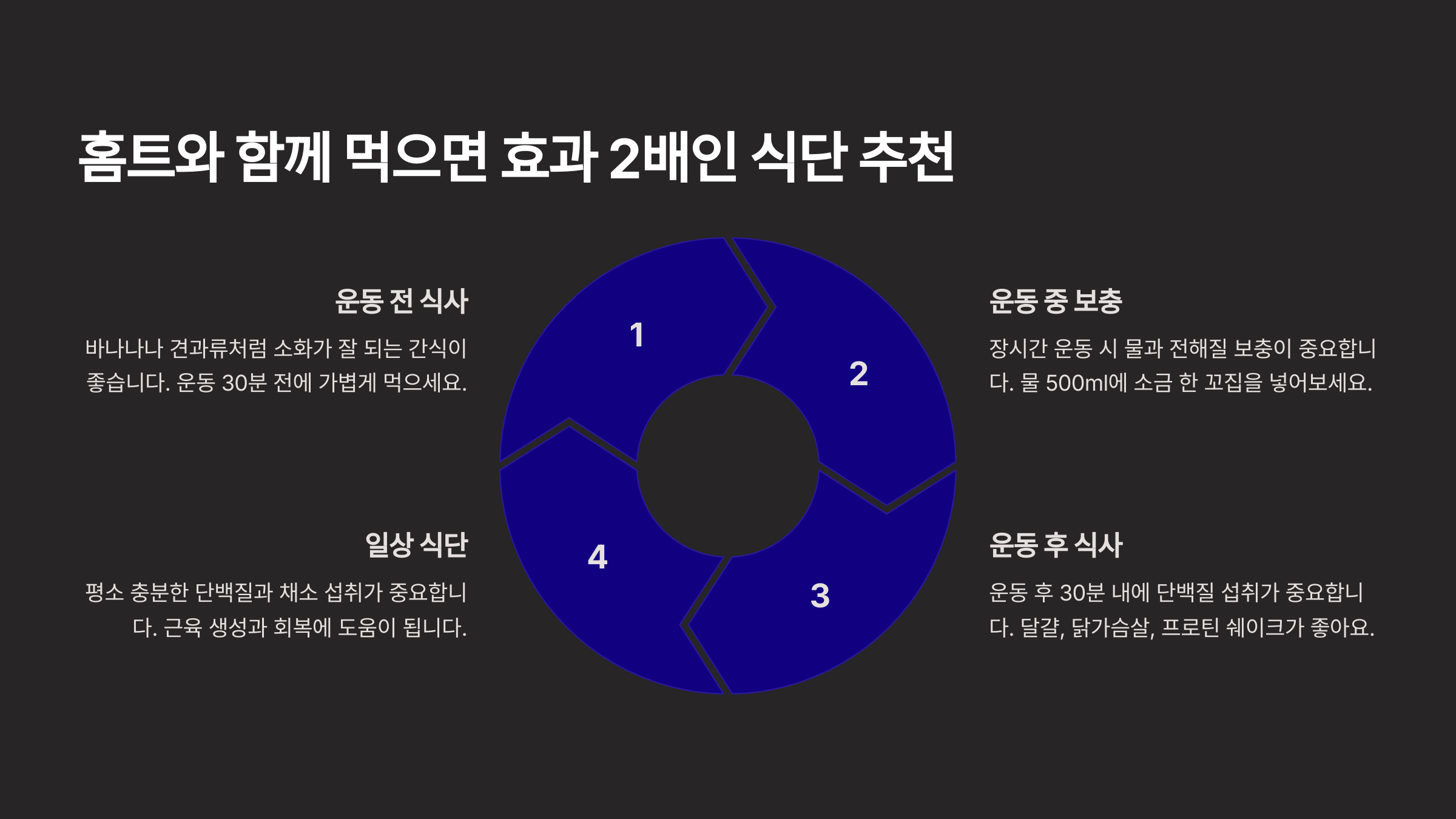 ✔️ **운동 후 식사**: 운동 후에는 근육 회복을 돕기 위해 고단백 식품을 섭취하는 것이 중요해요. 단백질 쉐이크, 그릭 요거트, 계란, 연어 등이 추천돼요.