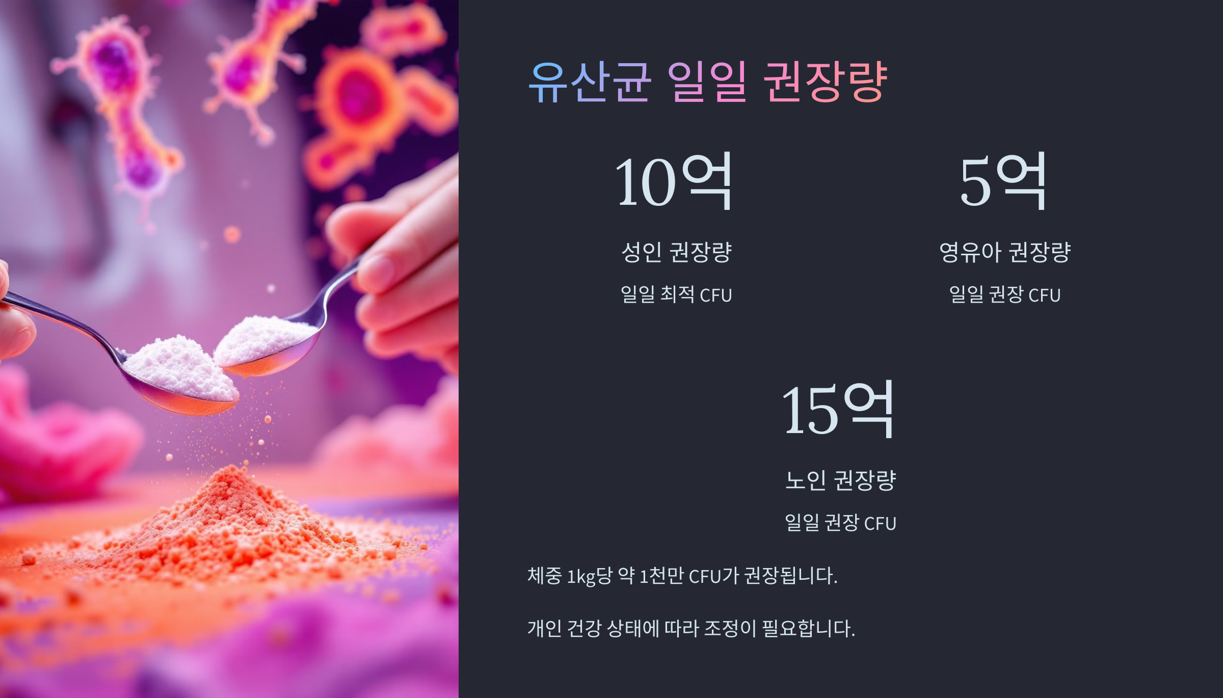 | 성인 (면역·장 트러블) | 50억 ~ 100억 | 의료 전문가 상담 필요 |