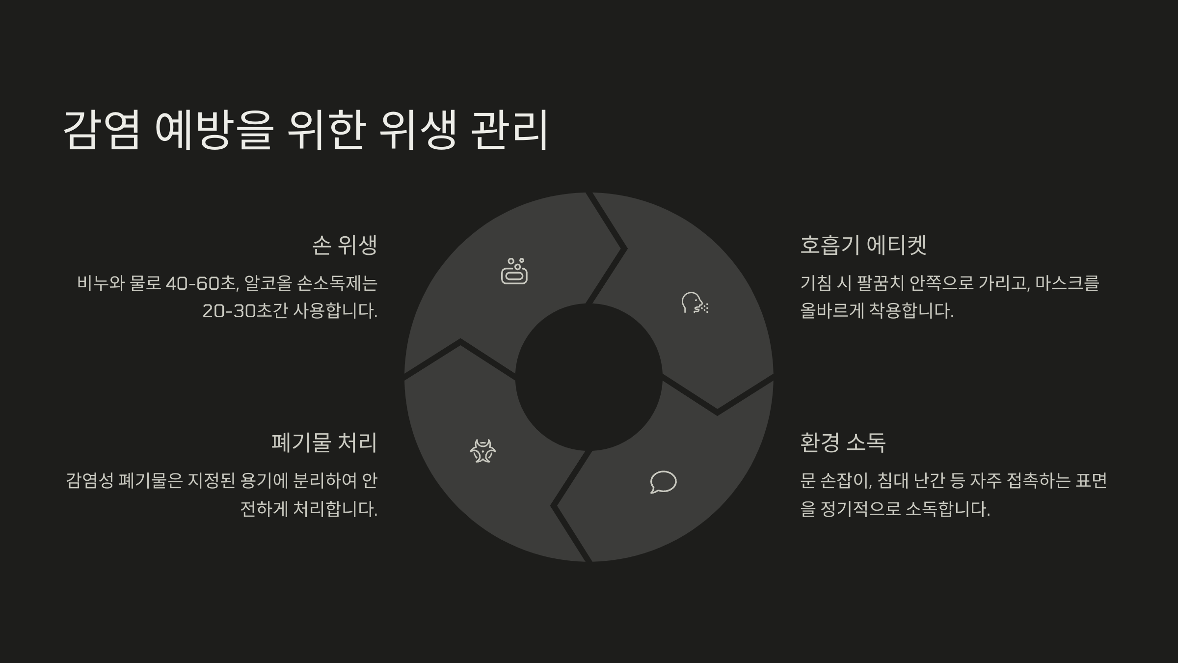 이제 감염 예방을 위한 위생 관리에 대해 알아볼게요.