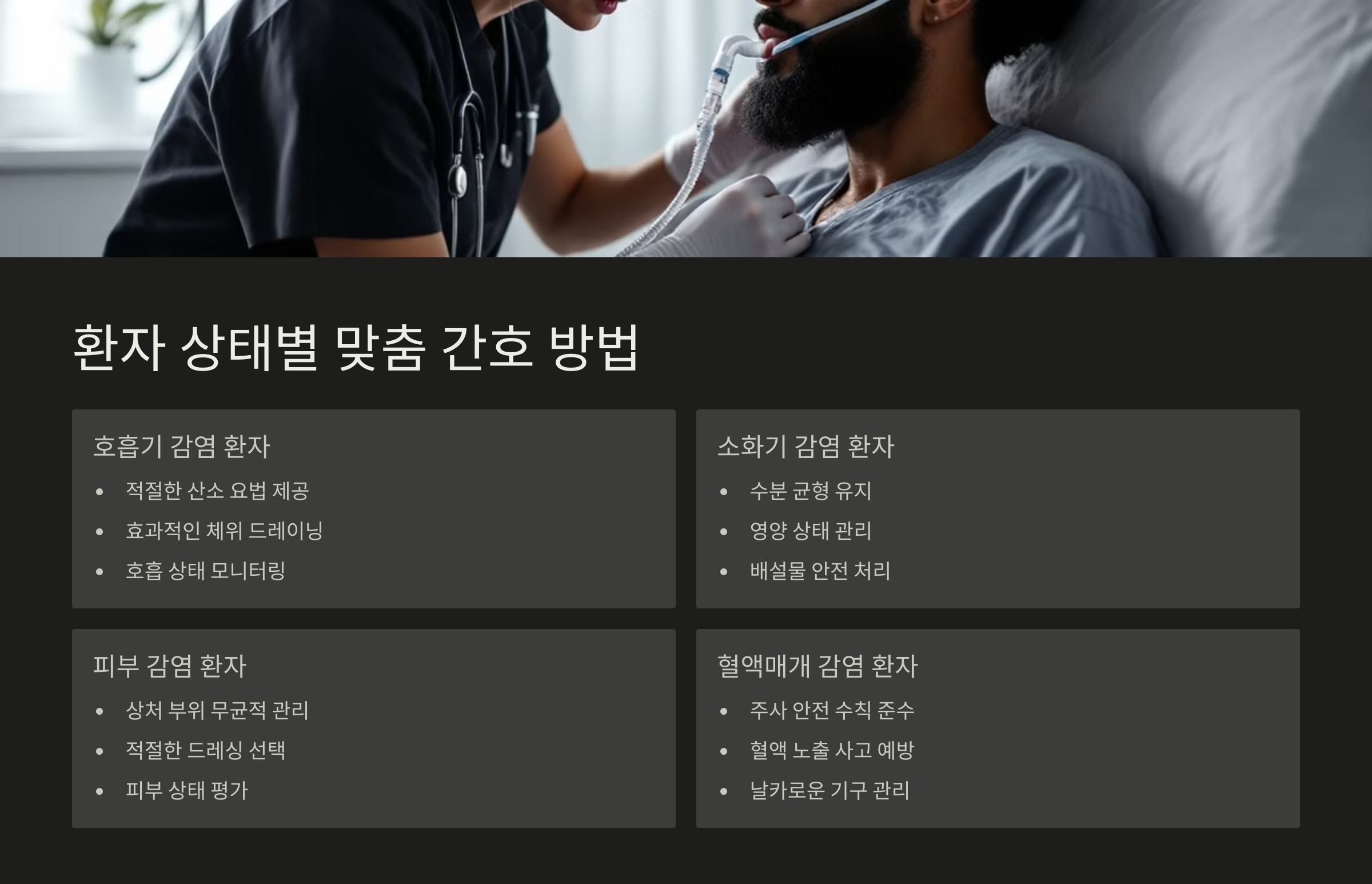 이제 환자 상태별 맞춤 간호 방법에 대해 알아볼게요.