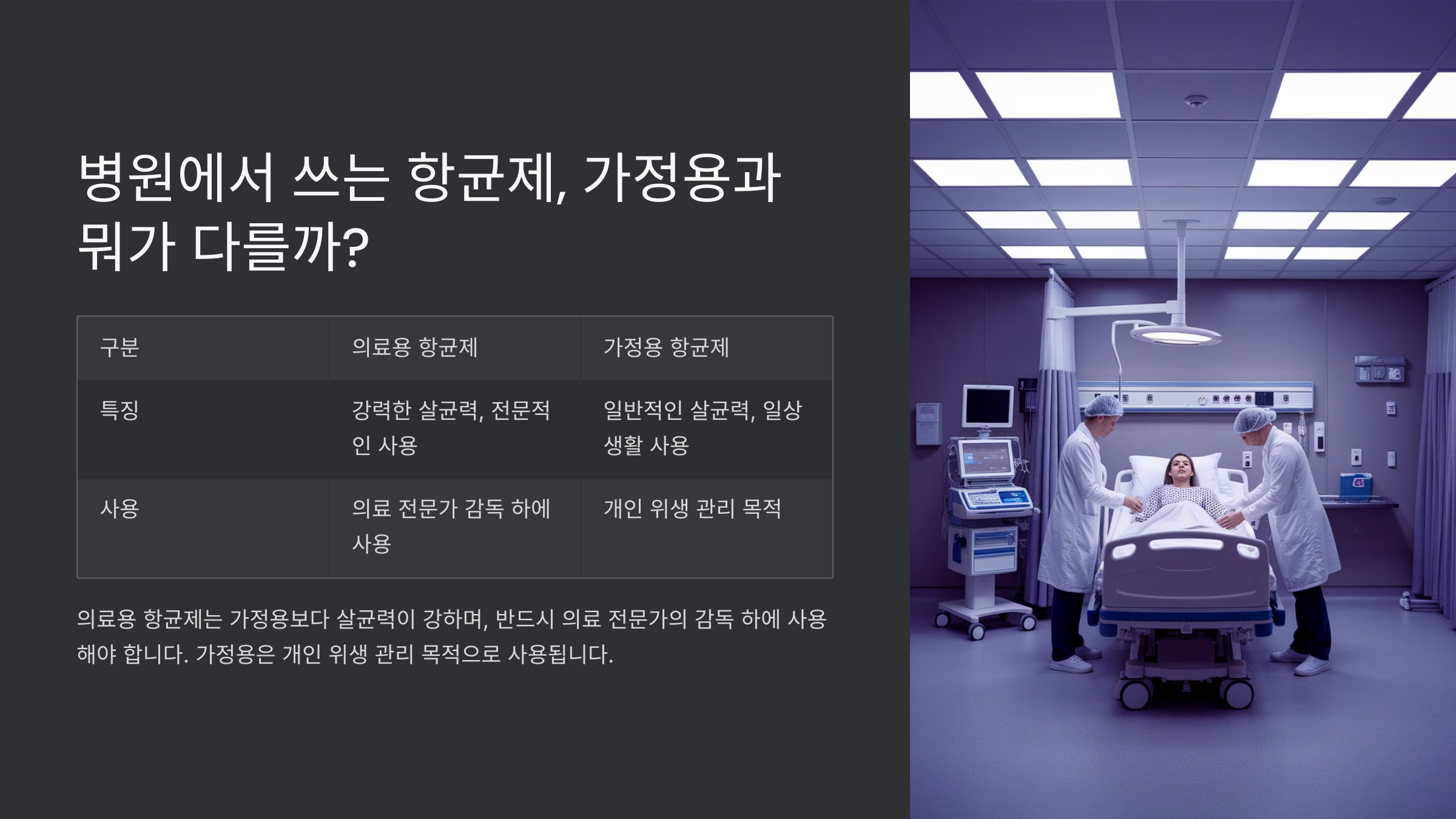 📢 그렇다면 병원에서 사용하는 항균제는 가정용과 어떤 차이가 있을까요? 다음 섹션에서 알아볼게요!