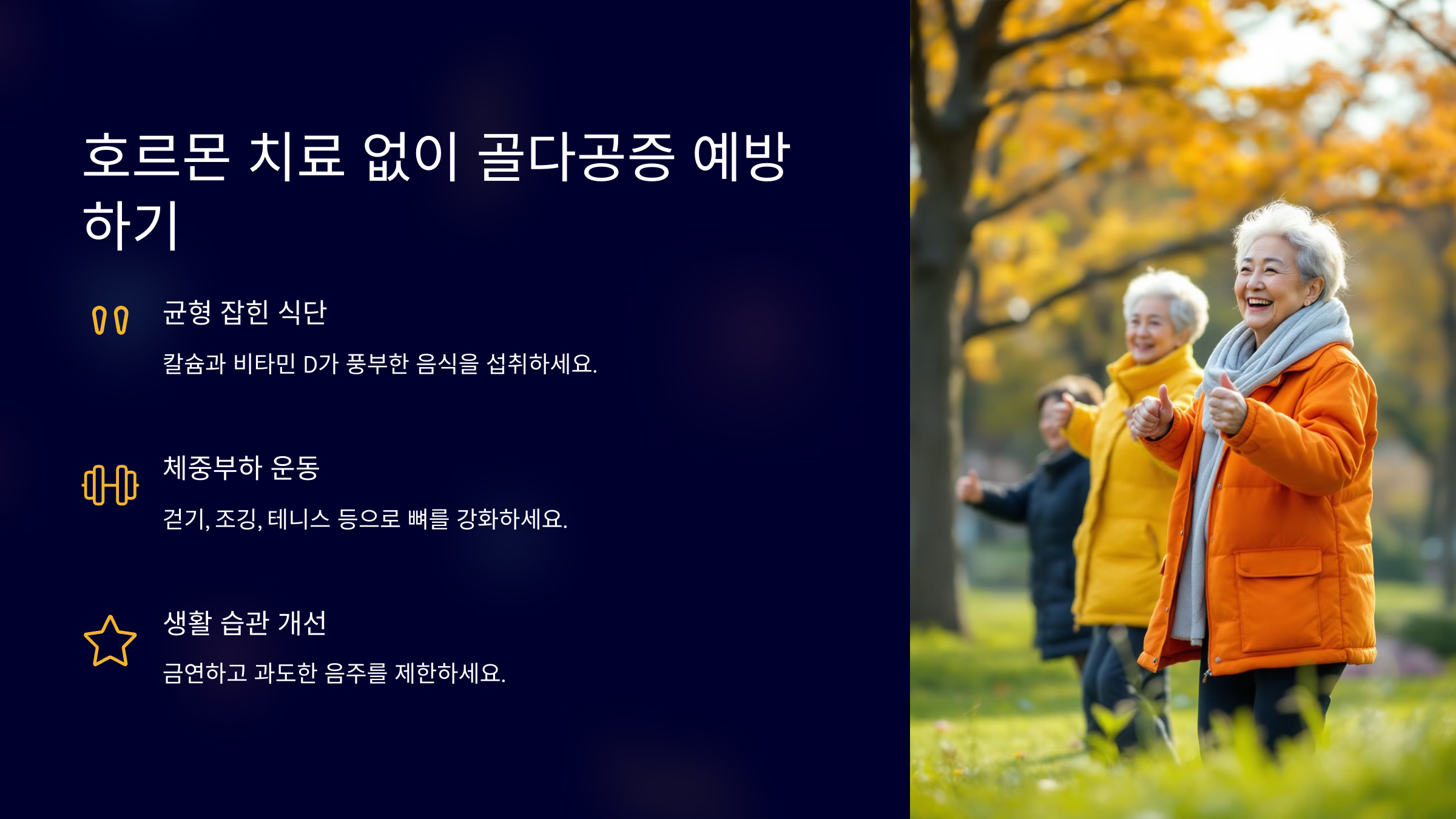 골다공증 예방을 위해 반드시 호르몬 치료를 해야 하는 것은 아니에요. 자연적인 방법으로도 충분히 뼈 건강을 유지할 수 있답니다. 생활 습관과 식단을 개선하면 뼈 손실을 줄이고 골밀도를 유지할 수 있어요.