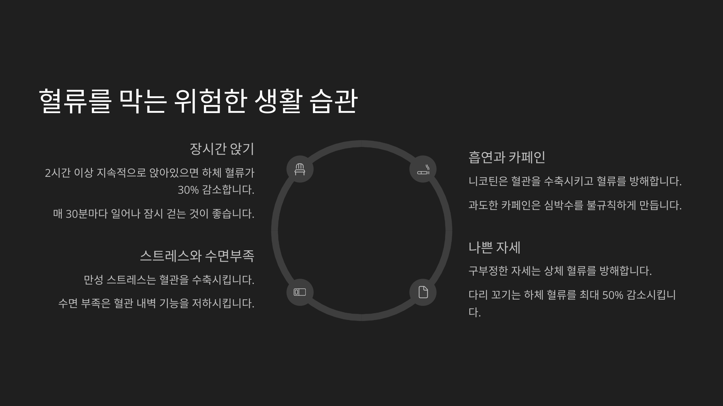 혈액순환을 망치는 습관들은 생각보다 가까운 곳에 숨어 있어요. 특히 장시간 앉아 있거나 다리를 꼬는 자세는 다리 혈류를 차단하고, 정맥 순환을 방해해요. 이런 자세가 반복되면 하지정맥류까지 이어질 수 있어서 주의가 필요해요.