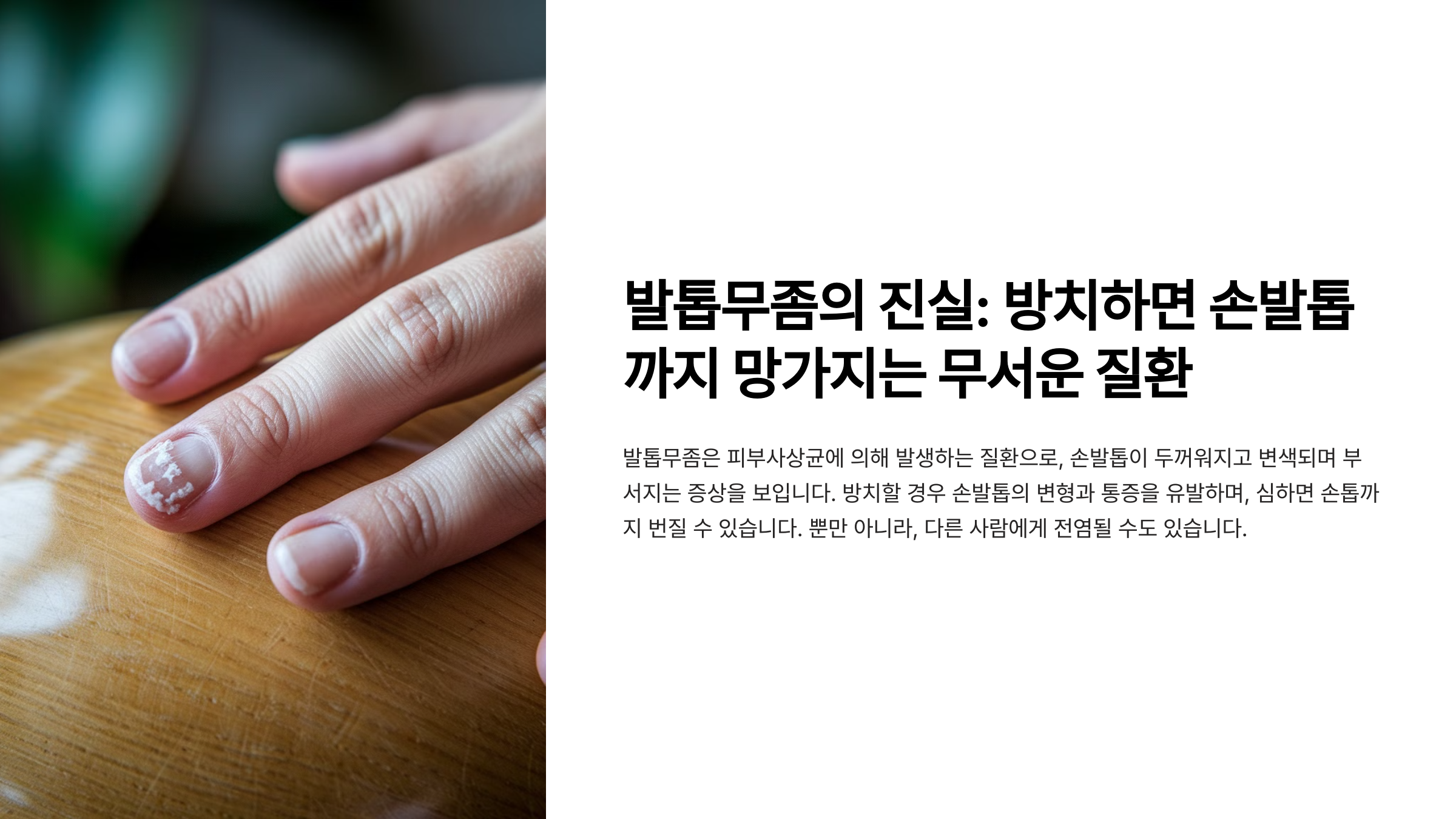 많은 사람들이 발톱무좀을 단순한 미용 문제로 생각해 방치하는 경우가 많지만, 시간이 지날수록 손톱까지 퍼질 가능성이 커요. 또한 가족 간 전염 위험이 높아 가정 내에서도 주의해야 해요. 지금부터 발톱무좀의 원인, 진행 과정, 치료법, 예방법 등을 자세히 알아볼게요!