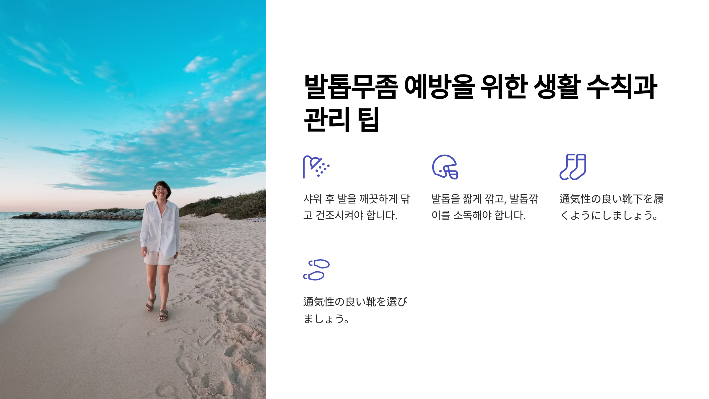 손발톱무좀을 예방하려면 발을 항상 청결하고 건조하게 유지하는 것이 가장 중요해요. 또한 공용 공간에서는 개인 위생을 철저히 관리해야 해요.