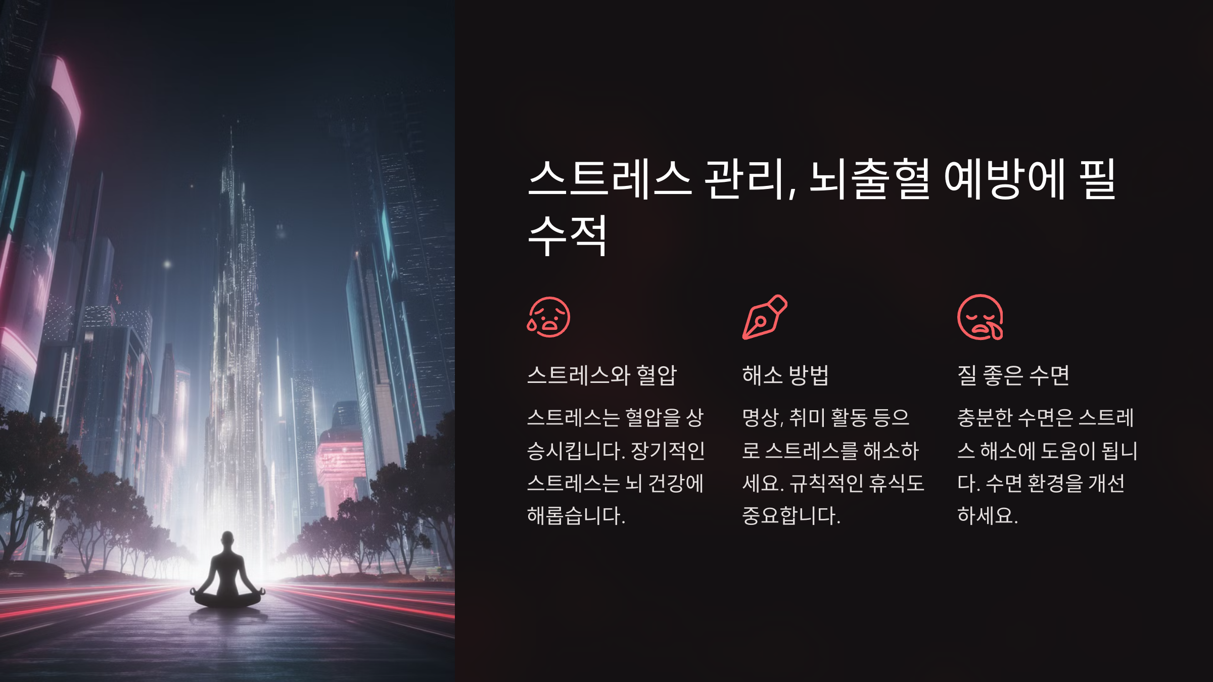 내가 생각했을 때, 스트레스는 눈에 보이지 않지만 뇌 건강에 아주 큰 영향을 주는 요소예요. 작은 스트레스 해소법을 실천하는 것이 뇌출혈 예방에 큰 도움이 될 거예요! 😊
