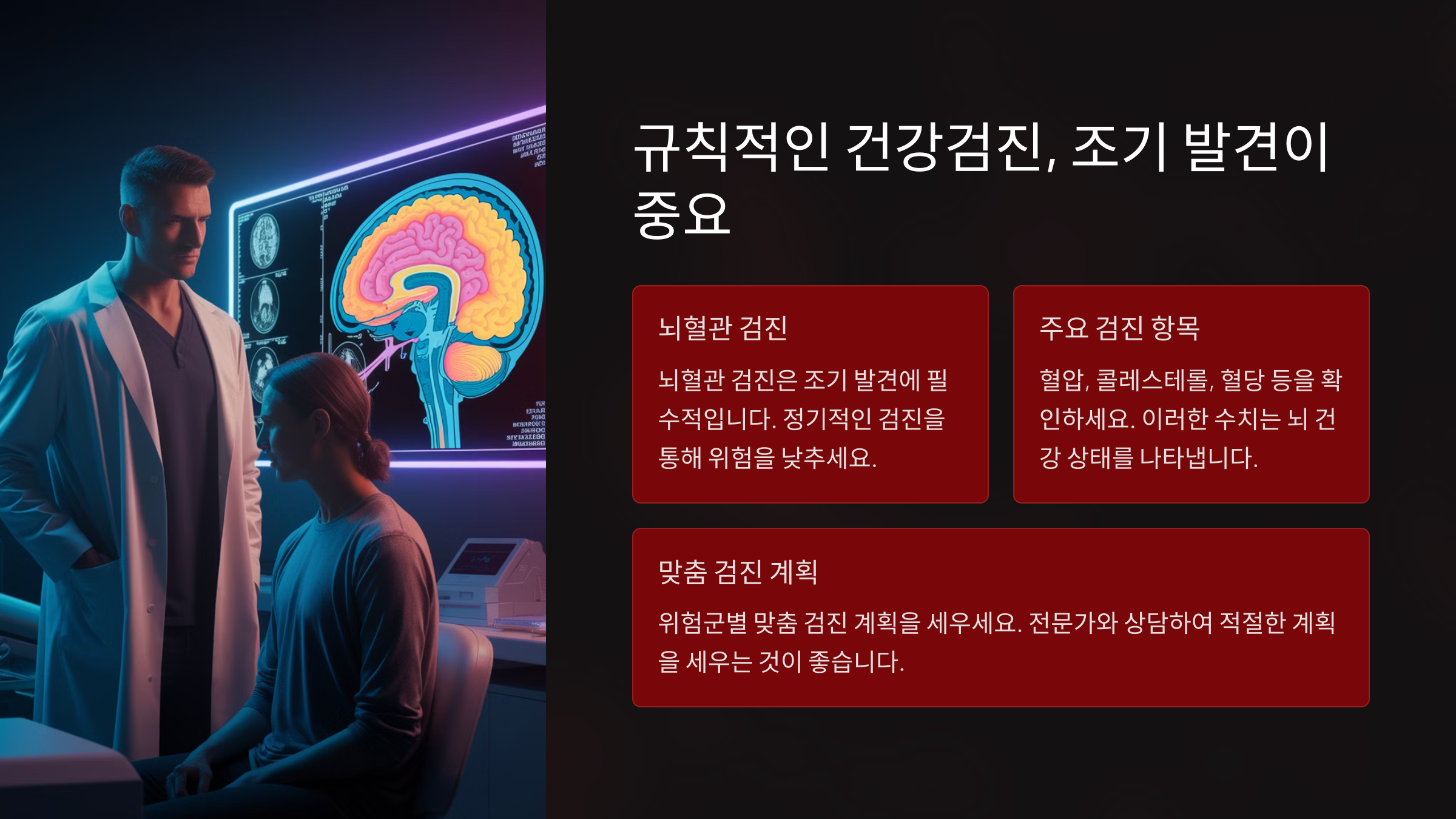 고혈압이나 당뇨병 같은 질환이 있는 경우, 정기적인 검진을 통해 혈관 건강을 점검해야 해요. 뇌 MRI나 CT 검사를 통해 혈관 이상이 있는지 확인하는 것도 도움이 될 수 있어요. 🧠