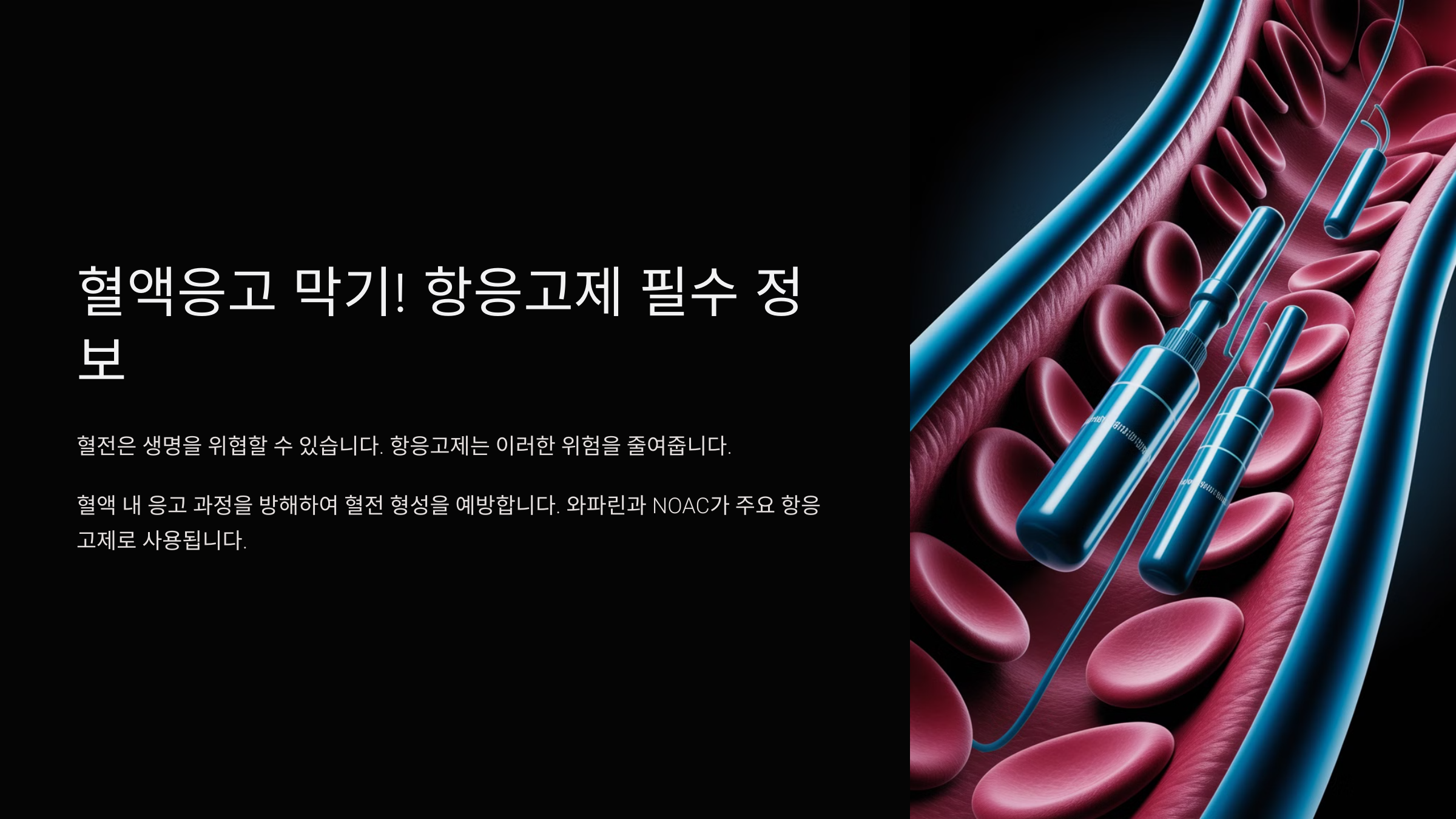 혈액응고(혈전 형성)는 우리 몸이 출혈을 막기 위해 자연적으로 일어나는 과정이에요. 하지만 이 과정이 과도하게 활성화되면 혈전이 생기고, 이는 혈관을 막아 뇌졸중이나 심근경색을 유발할 수 있어요. 항응고제는 이러한 혈전 생성을 방지하는 약물이에요. 🩸