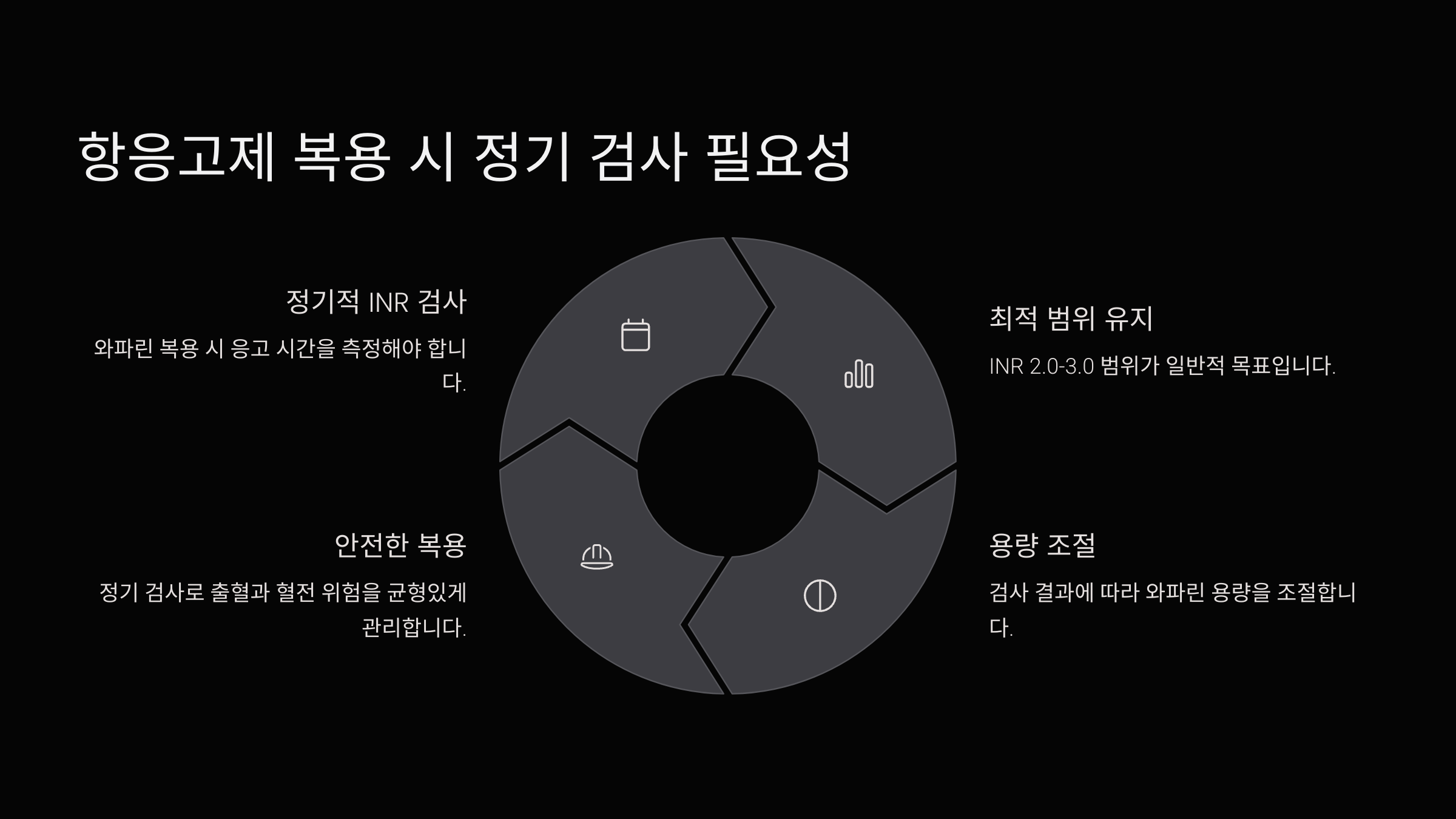 항응고제는 혈전 예방에 효과적이지만, 출혈 위험이 동반될 수 있어요. 따라서 정기적인 검사를 통해 혈액 응고 상태를 확인하는 것이 중요해요. 특히 와파린을 복용하는 경우 ‘INR(국제 정상화 비율)’ 수치를 주기적으로 체크해야 해요. 🩸