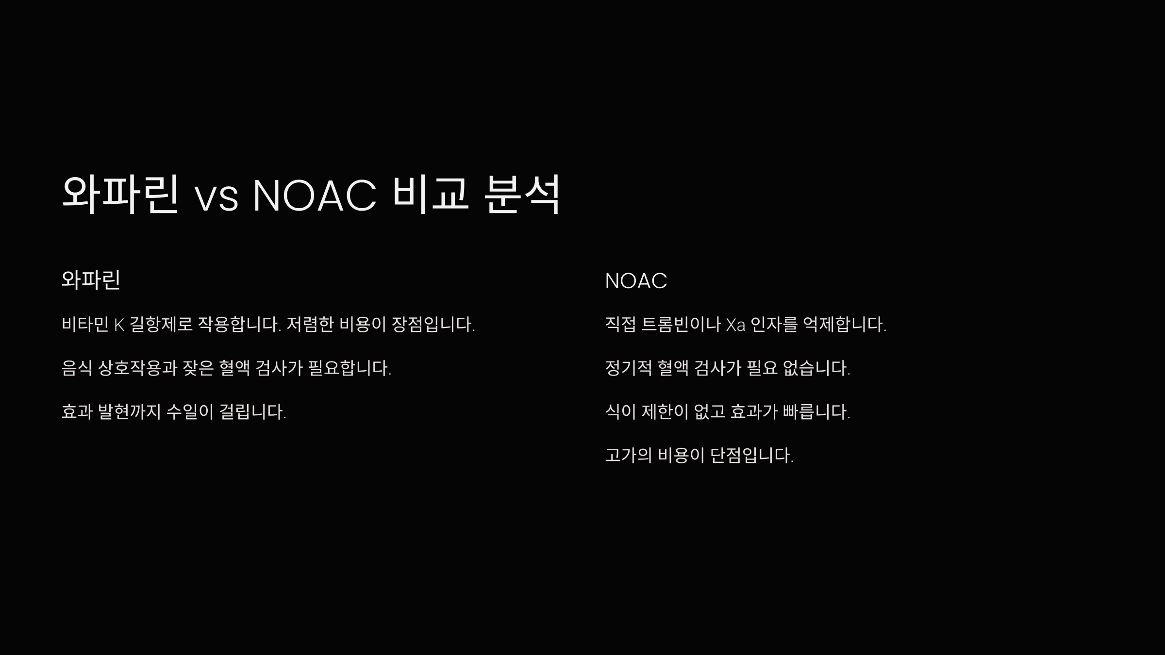 항응고제 중 가장 널리 알려진 약물이 ‘와파린’이에요. 오랜 기간 사용된 전통적인 항응고제죠. 하지만 최근에는 ‘NOAC(신규 경구 항응고제)’가 등장하면서 선택지가 넓어졌어요. NOAC은 사용이 간편하고 부작용이 적다는 장점이 있어요. 😃