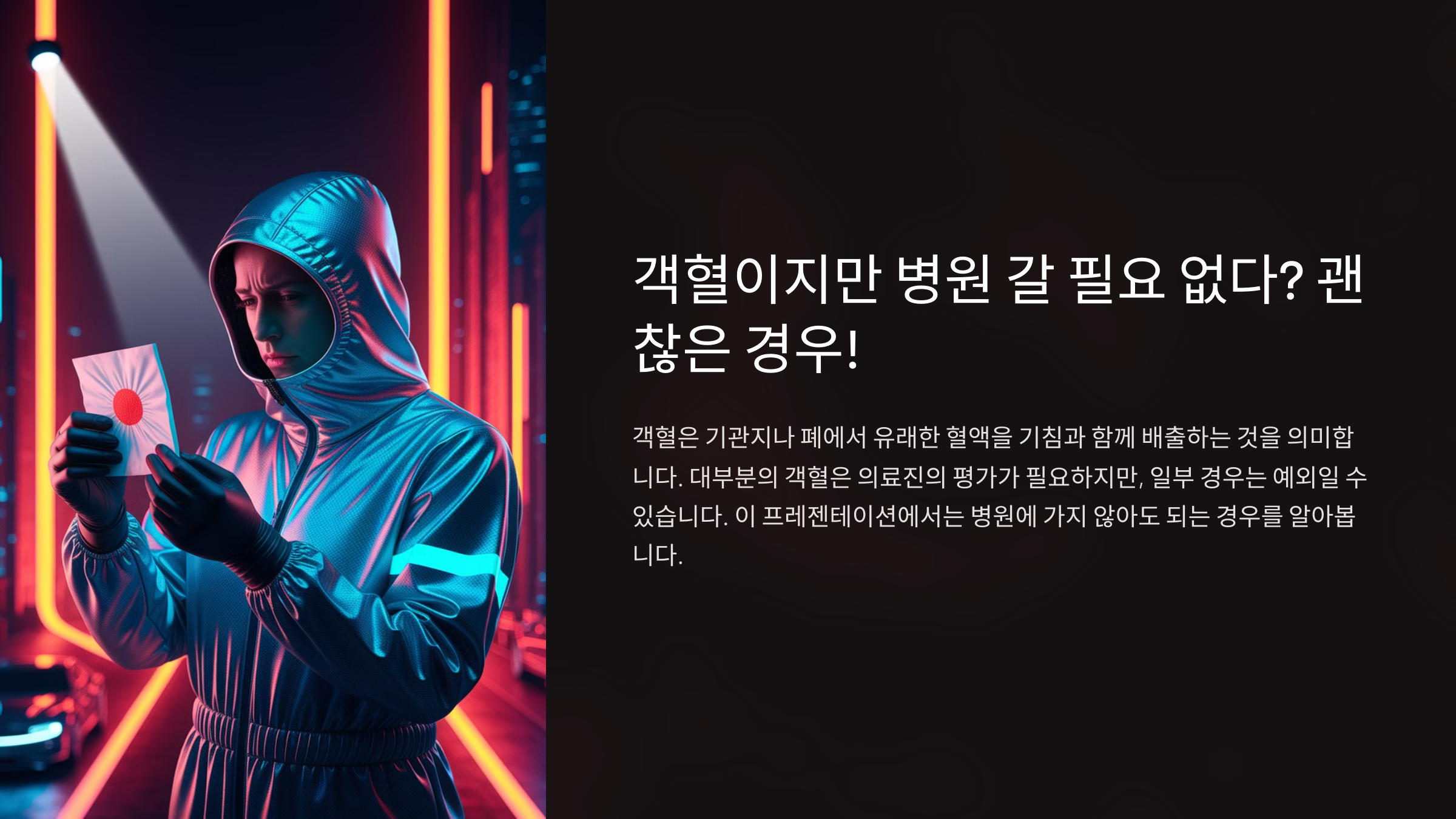 객혈(喀血)은 가래에 피가 섞여 나오는 증상을 말해요. 피를 보면 누구나 깜짝 놀라지만, 모든 객혈이 위험한 것은 아니에요. 가벼운 원인으로 발생하는 경우도 많답니다.