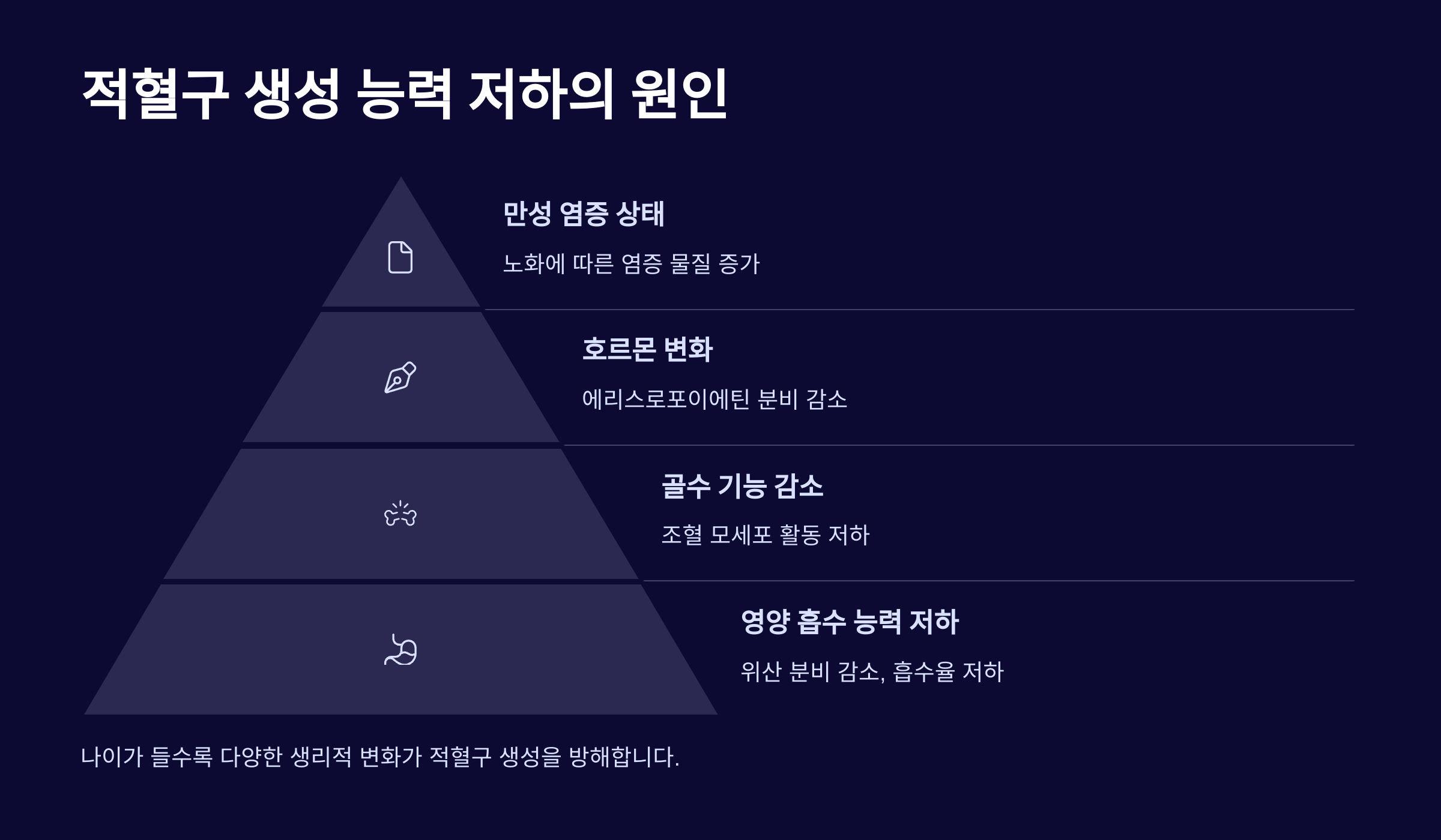 적혈구는 골수에서 생성되며, 신장에서 분비되는 에리트로포이에틴(EPO)이라는 호르몬이 이를 조절해요. 그런데 나이가 들수록 이 과정이 원활하지 않게 되죠. 여러 가지 요인이 복합적으로 작용하면서 적혈구 생성 능력이 떨어질 수 있어요.