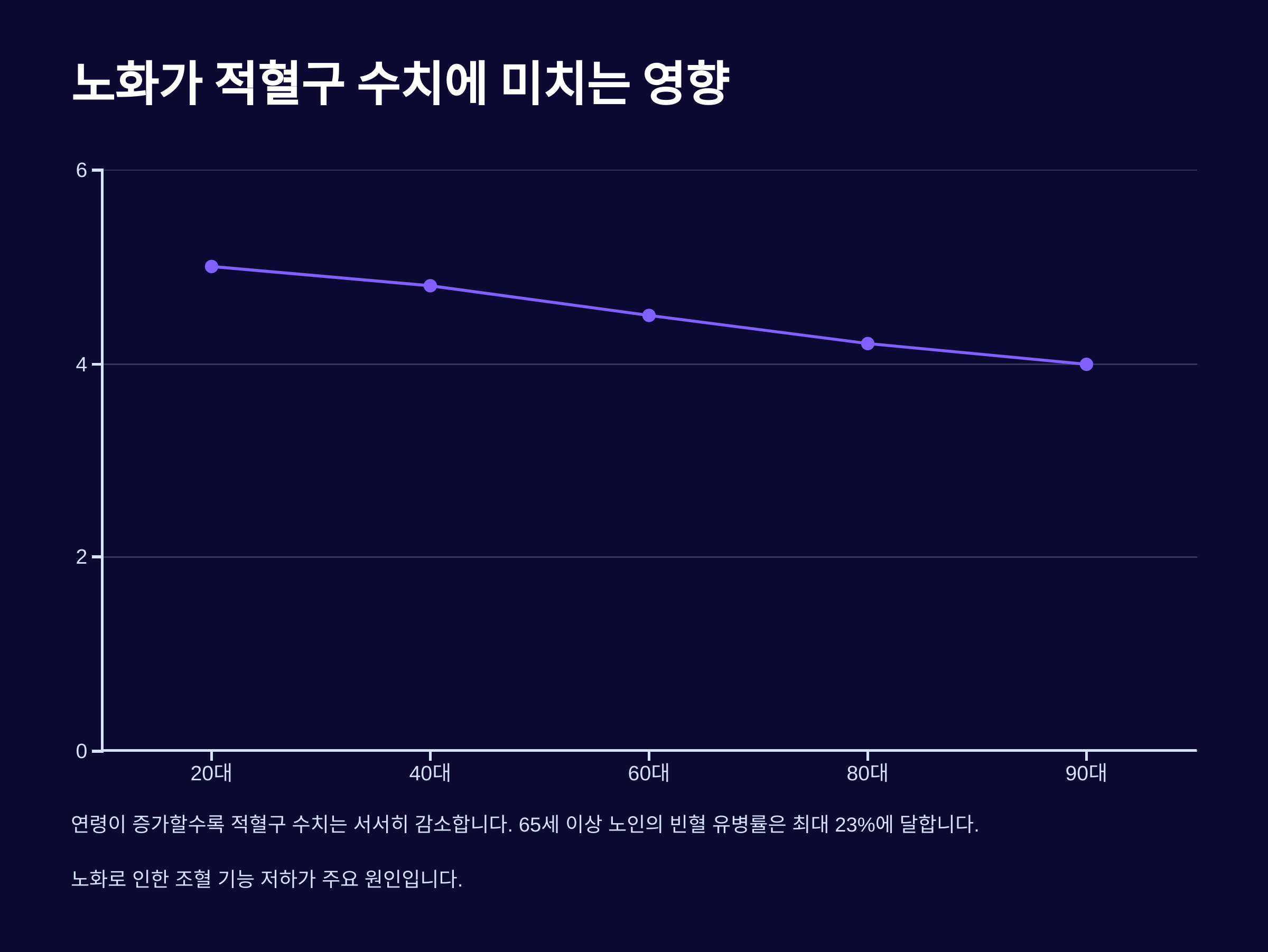 또한, 혈액 속 산소가 부족해지면 쉽게 피로를 느끼고, 두통이나 어지럼증 같은 증상이 자주 나타날 수 있어요. 따라서 노년기에는 적혈구 수치를 꾸준히 체크하며 혈액 건강을 관리하는 것이 중요하답니다.