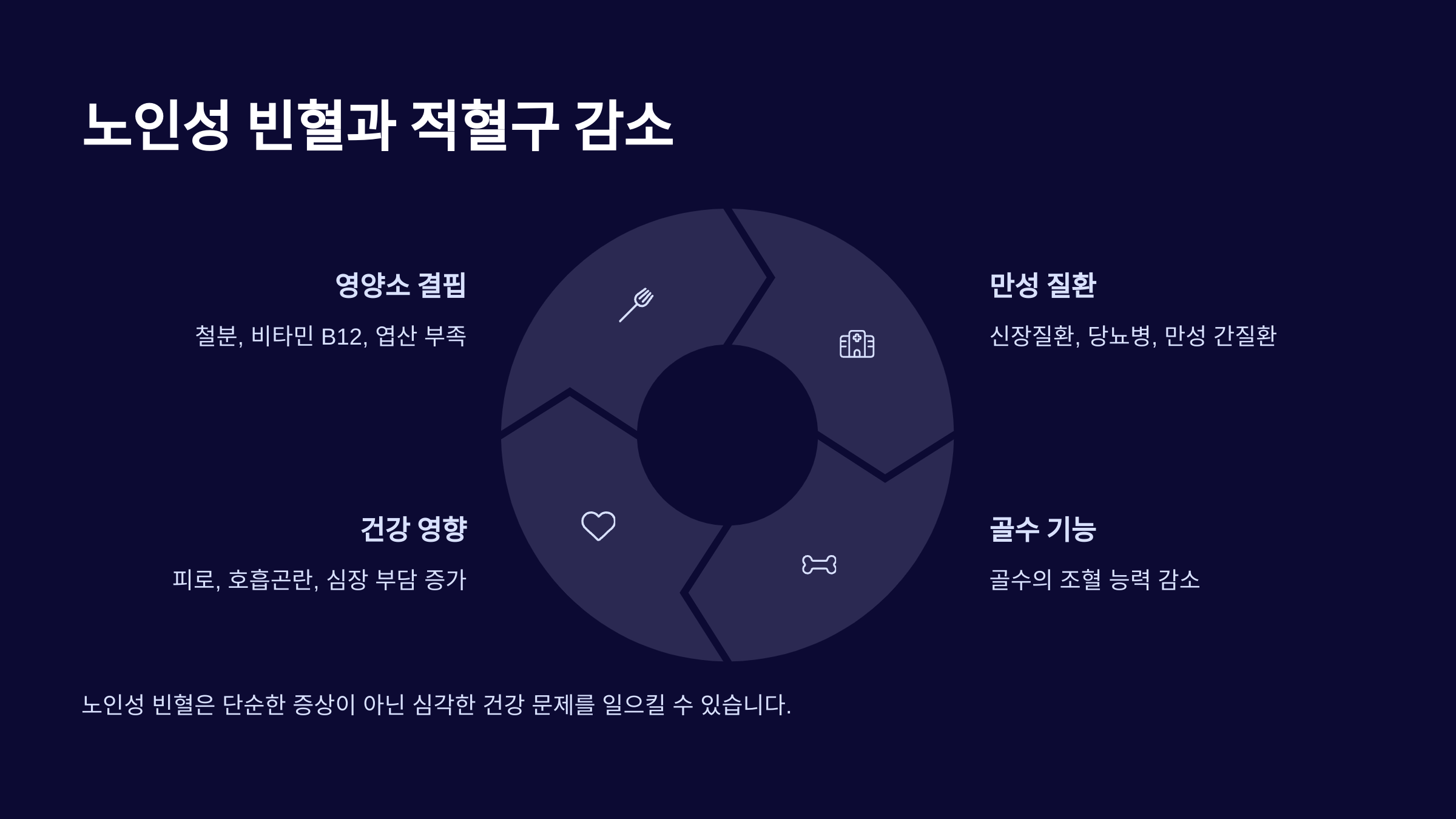 이 외에도 만성 신부전, 암, 류마티스 관절염 같은 만성 질환이 있을 경우, 염증 반응이 지속되면서 조혈 기능이 저하될 수 있어요. 따라서 고령층에서 갑작스러운 피로감이나 숨 가쁨, 어지럼증이 느껴진다면 빈혈 여부를 확인해 보는 것이 좋아요.