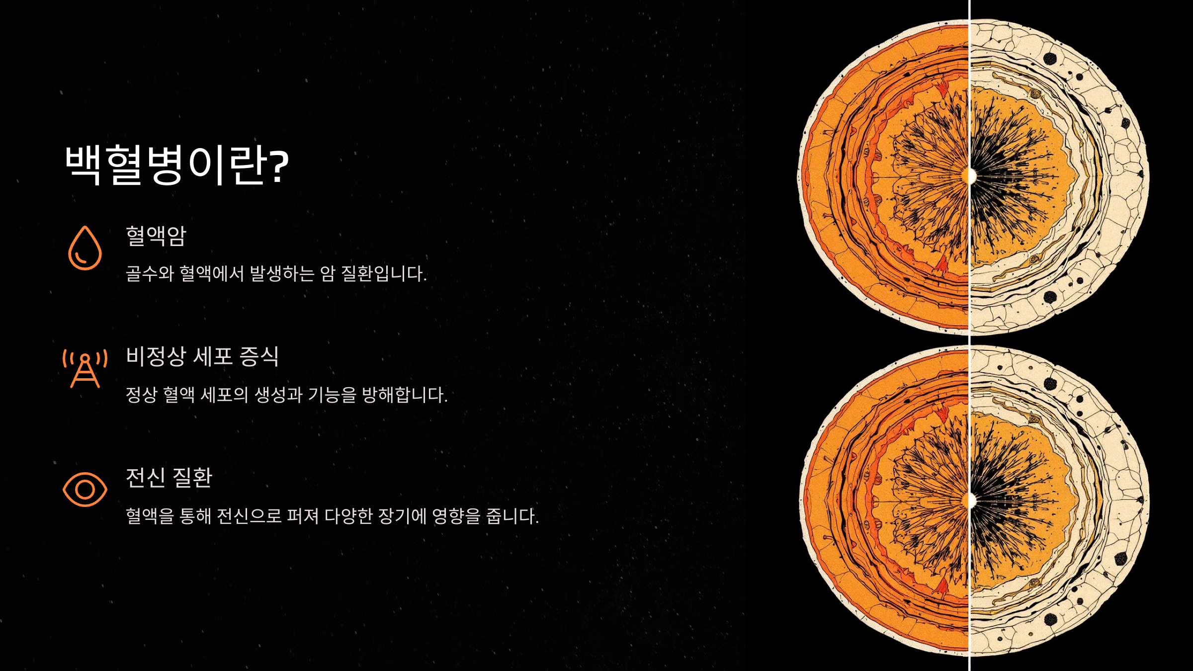 백혈병(Leukemia)은 혈액암의 일종으로, 골수에서 비정상적인 백혈구가 과도하게 증식하면서 정상적인 혈액 세포 생성을 방해하는 병이에요. 백혈구는 몸을 방어하는 중요한 면역세포인데, 암세포로 변형되면 면역 기능이 약해지고 다양한 건강 문제가 발생해요.