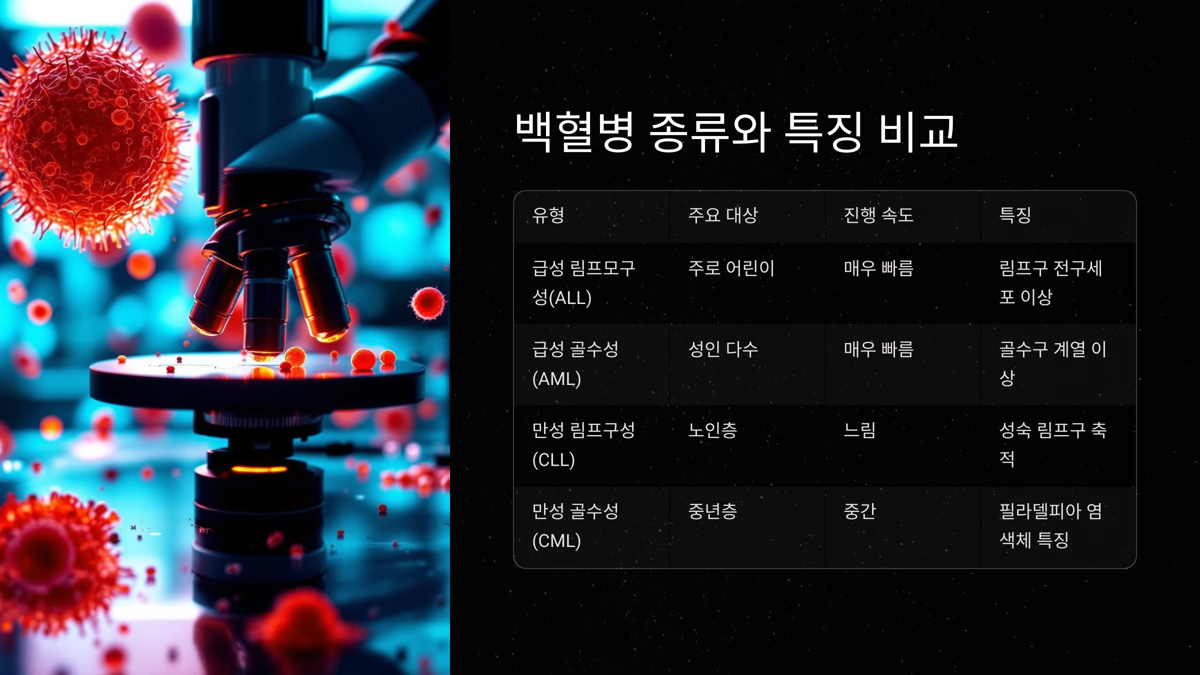 어떤 백혈병이든 조기 발견과 적극적인 치료가 생존율을 높이는 가장 중요한 요소예요. 아래 표를 통해 백혈병의 종류와 특징을 한눈에 비교해 볼 수 있어요. 🩸