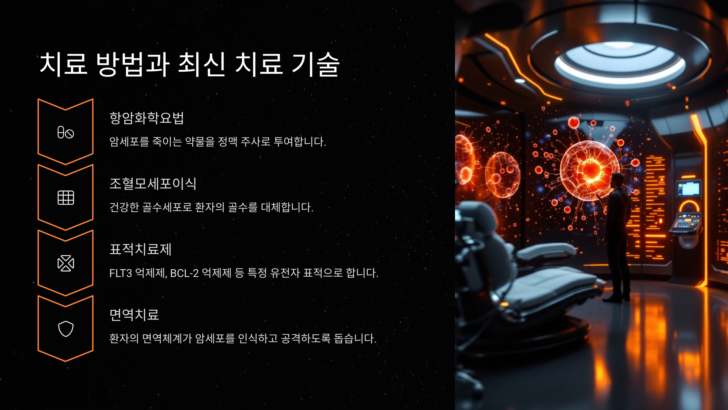 치료법 중 어떤 것이 적합한지는 환자의 상태에 따라 다르게 결정돼요. 예를 들어, 급성 백혈병 환자는 빠른 항암 치료가 필요하지만, 만성 백혈병 환자는 장기적인 관리가 중요해요.