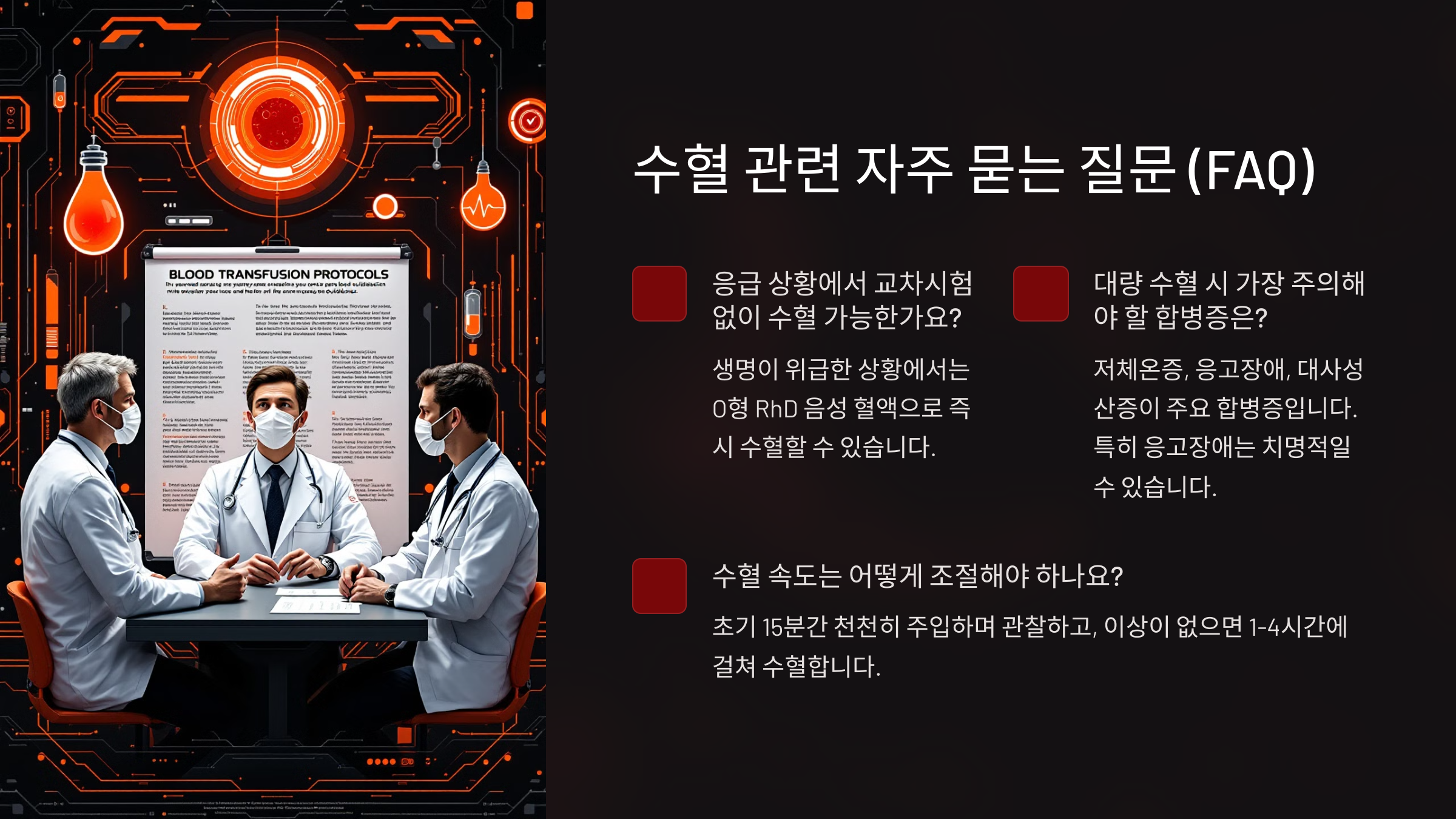 A3. 다량 수혈 시 혈액 응고 장애, 전해질 불균형, 체온 저하 등의 부작용이 발생할 수 있어요. 이를 방지하기 위해 의료진이 철저하게 모니터링하면서 적절한 비율로 혈액을 보충해요.