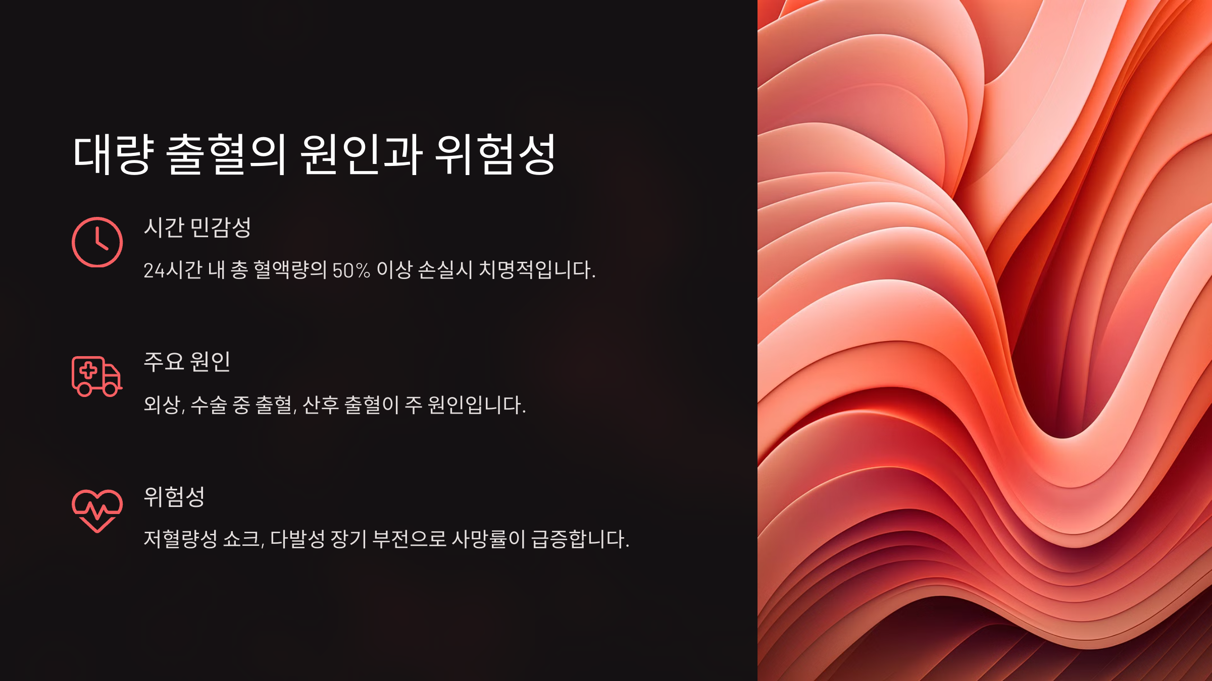 대량 출혈은 다양한 원인으로 발생할 수 있으며, 신속한 조치를 하지 않으면 생명을 위협하는 심각한 상태로 이어질 수 있어요. 출혈이 과도하면 혈압이 급격히 떨어지고, 장기 기능이 저하되며, 최악의 경우 다발성 장기 부전(MODS)으로 발전할 수 있죠.