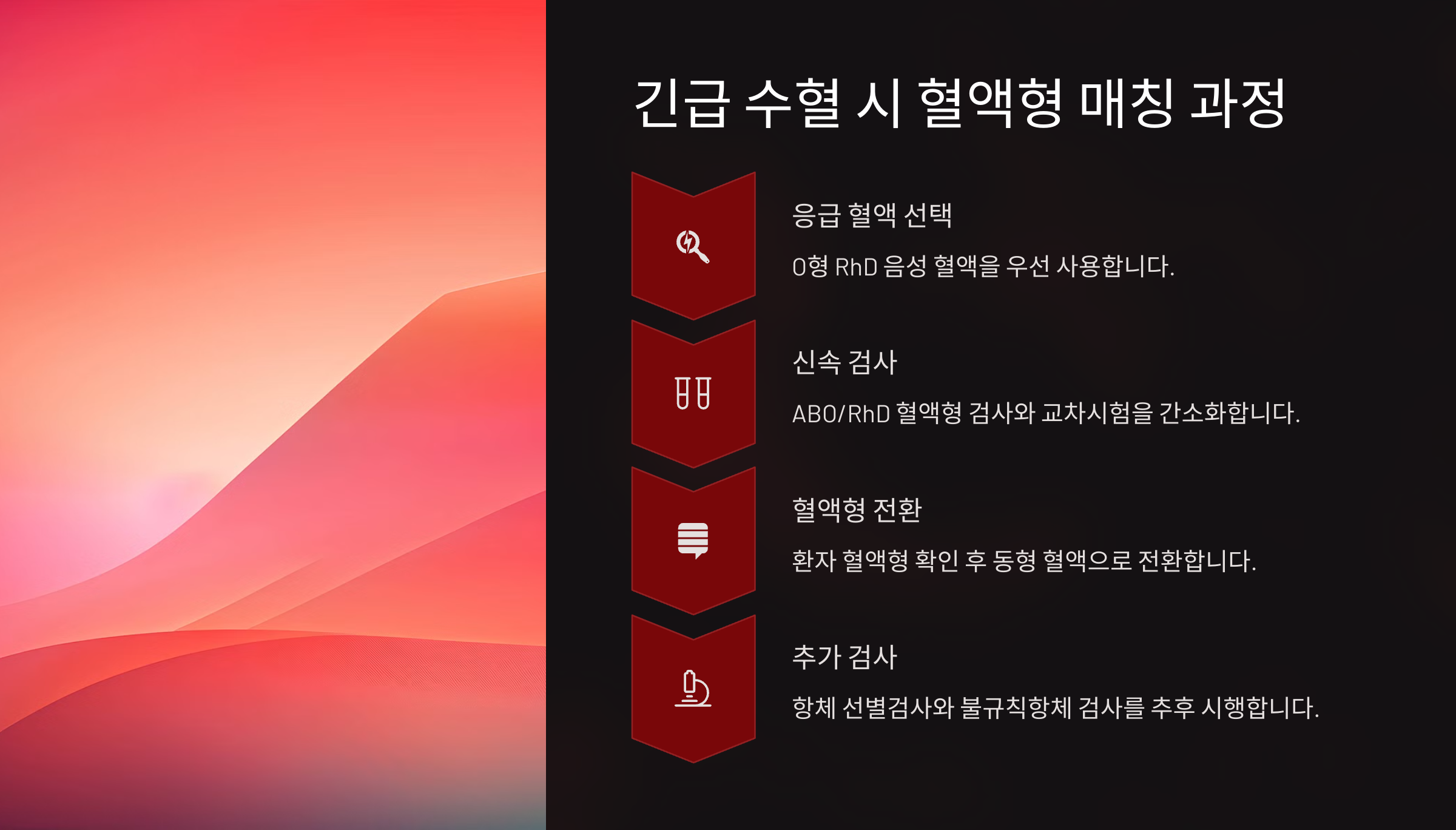 출혈량이 많아질수록 수혈이 필수적이에요. 하지만 무분별한 수혈은 또 다른 위험을 초래할 수 있기 때문에 정확한 혈액형 매칭과 수혈량 조절이 중요하답니다.
