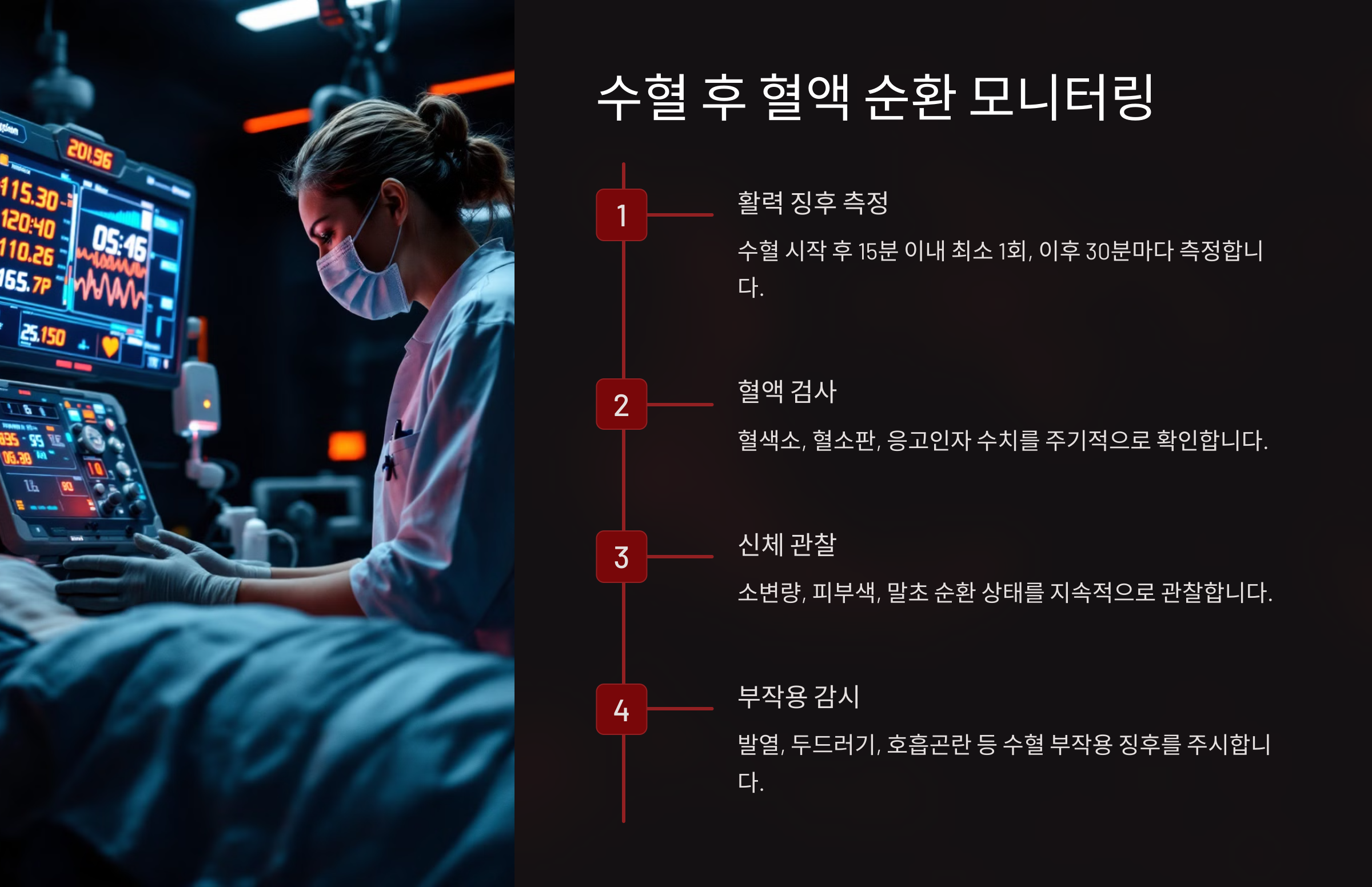 | 4. 수혈 후 모니터링 | 수혈 반응 및 혈압, 맥박 확인 |