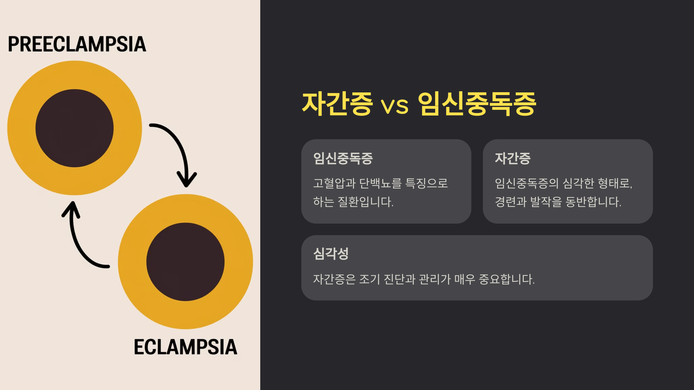 | 주요 증상 | 고혈압, 단백뇨, 두통, 시야 이상 | 발작, 의식 소실, 심한 경련 |