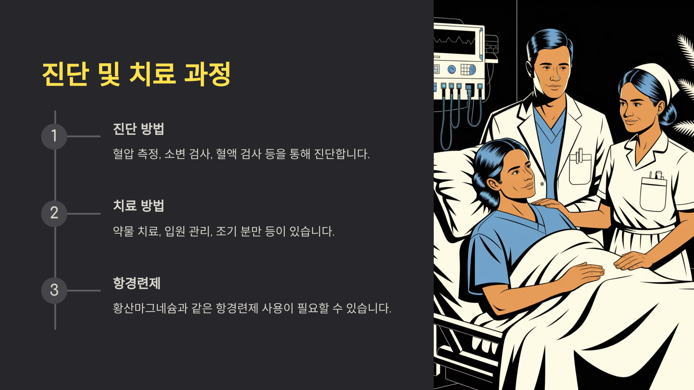 | 3. 약물 치료 | 항경련제(황산마그네슘), 혈압 강하제 투여 |