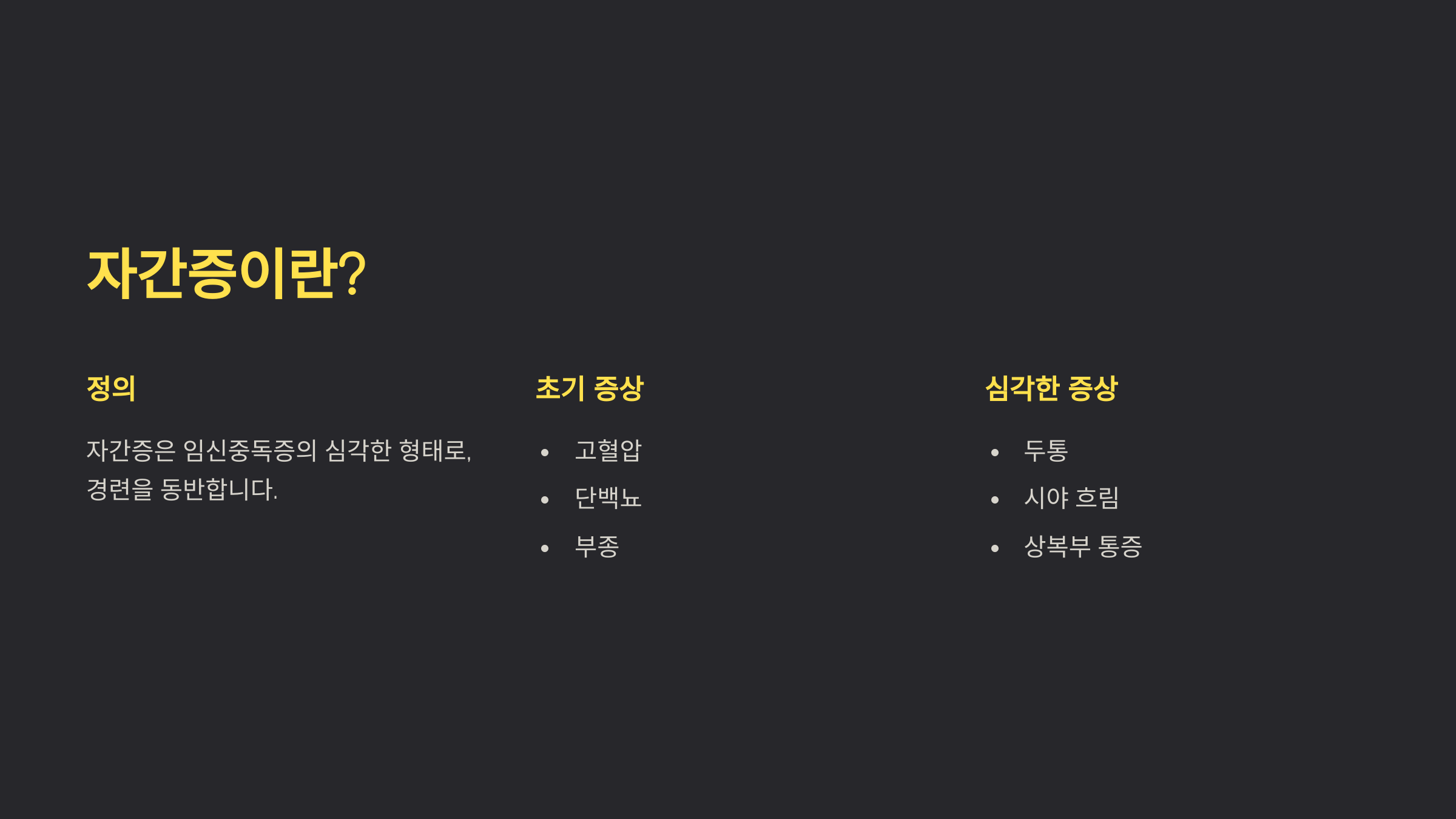 자간증은 임신 중 혈압이 심하게 상승하면서 발작, 경련, 의식 소실 등의 신경학적 증상을 동반하는 질환이에요. 보통 임신중독증(전자간증)이 악화되면서 발생하는데, 산모와 태아의 생명을 위협할 수 있어요.