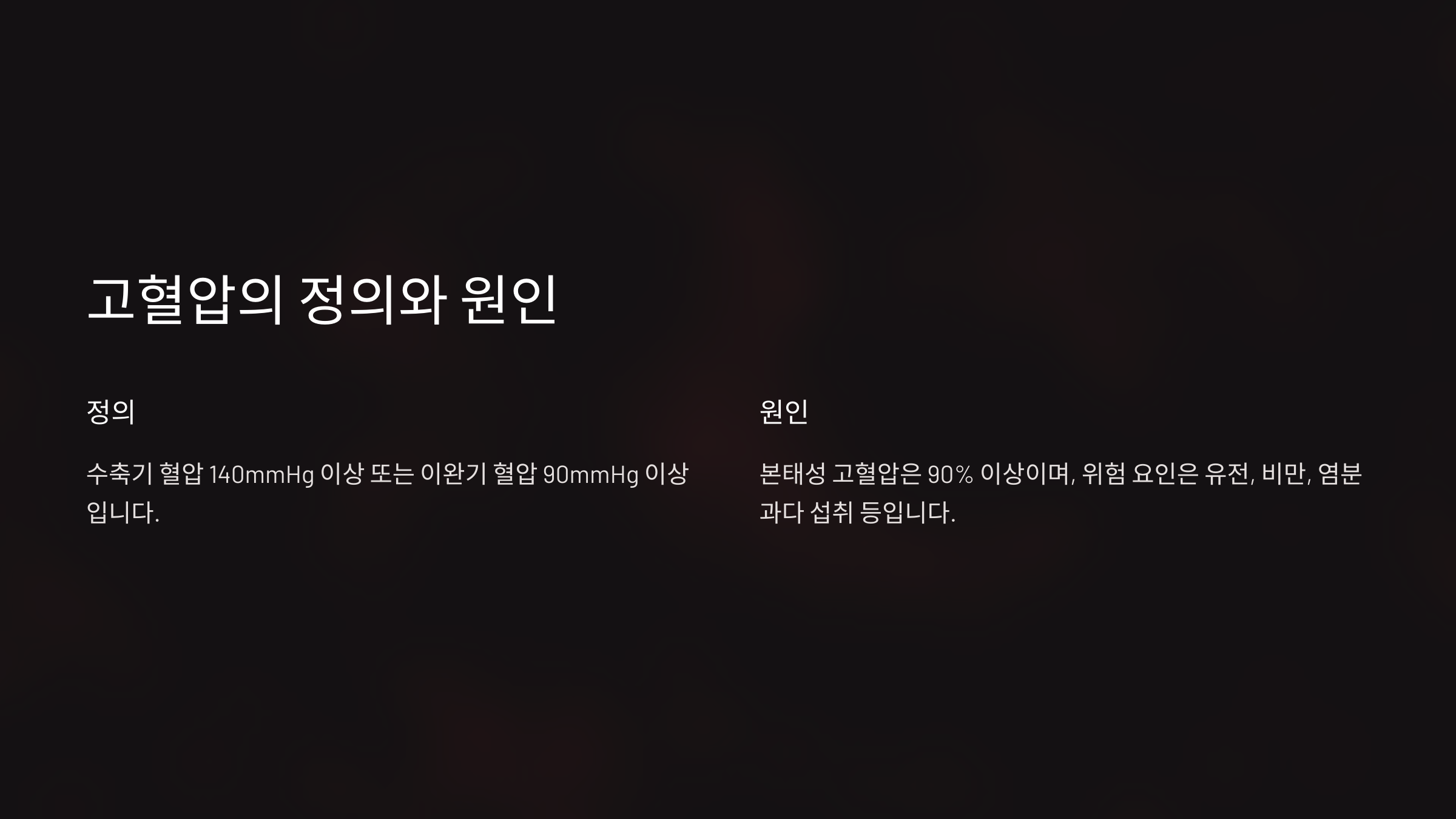 고혈압(Hypertension)은 혈압이 정상 범위를 초과하여 지속적으로 높은 상태를 의미해요. 일반적으로 수축기 혈압(최고 혈압)이 140mmHg 이상이거나 이완기 혈압(최저 혈압)이 90mmHg 이상일 때 고혈압으로 진단돼요.