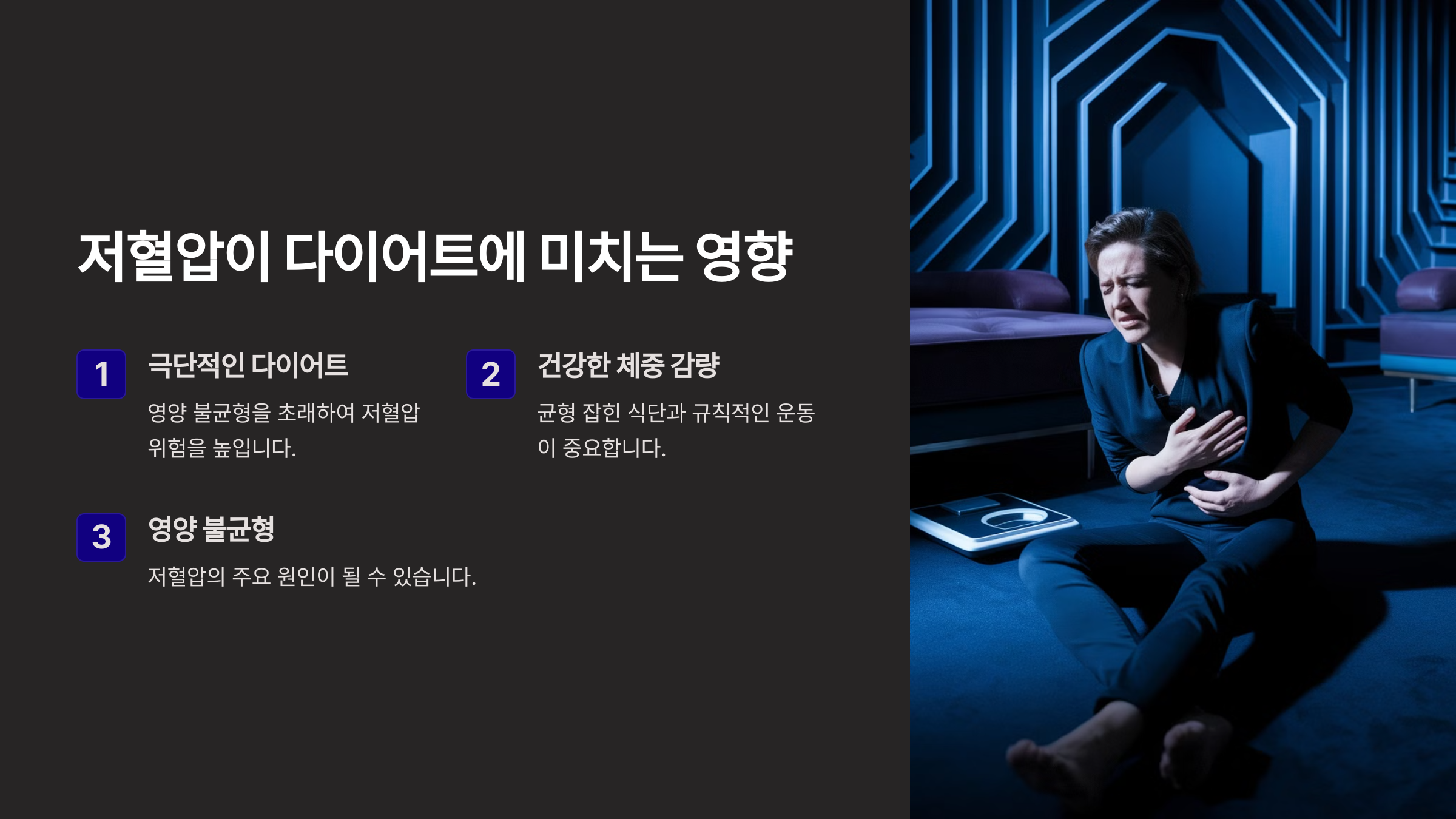 건강한 다이어트를 하려면 충분한 영양을 섭취하면서 혈압을 유지하는 것이 중요해요. 특히 아침을 거르면 저혈압 증상이 심해질 수 있으니, 간단한 샐러드나 단백질 음식을 꼭 챙겨 먹는 게 좋아요. 😊