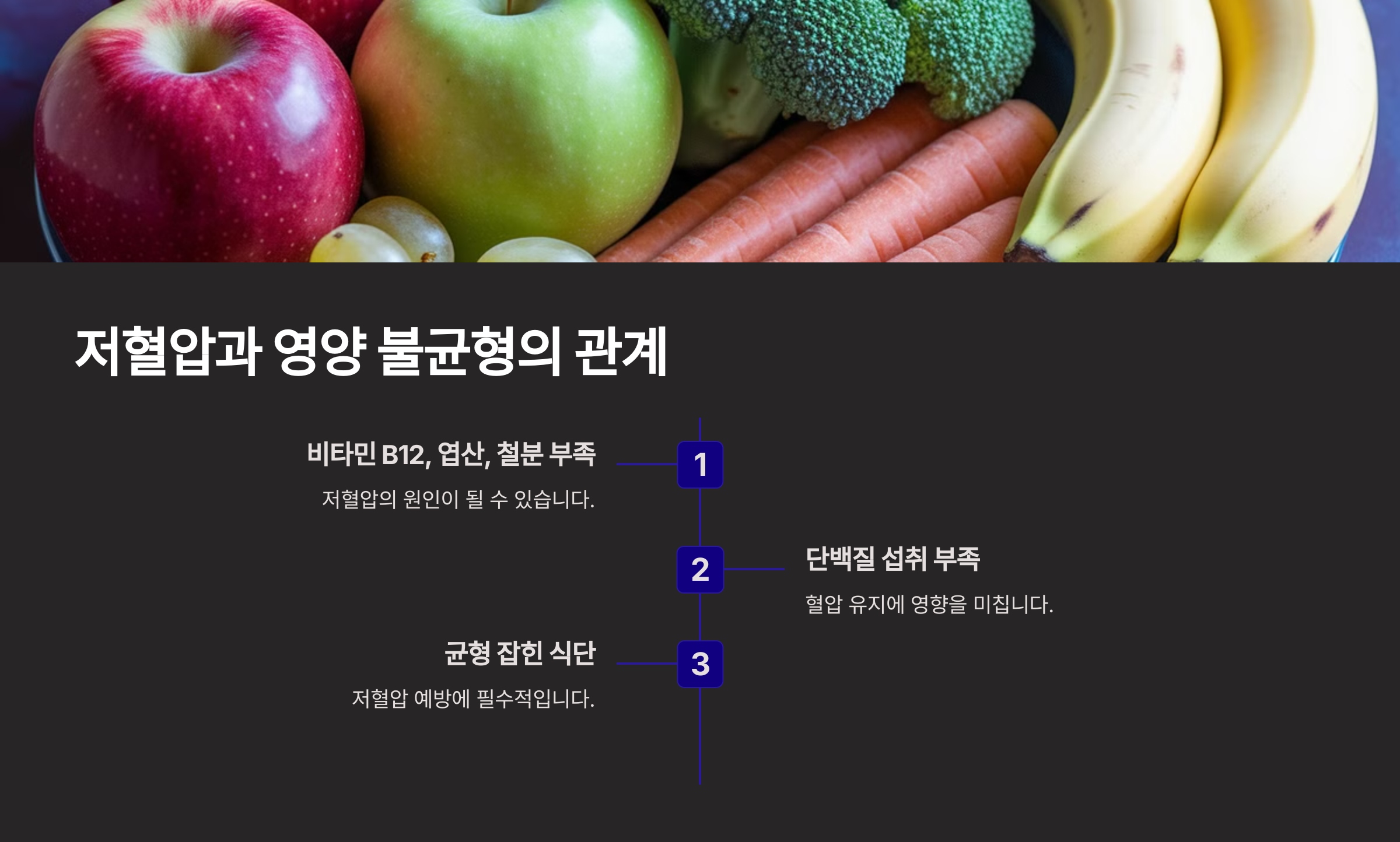 이렇게 실생활에서 조금만 신경 써도 저혈압 증상을 완화할 수 있답니다. 하지만 식습관도 중요한데, 저혈압과 영양 불균형은 어떤 관계가 있을까요? 🍽️